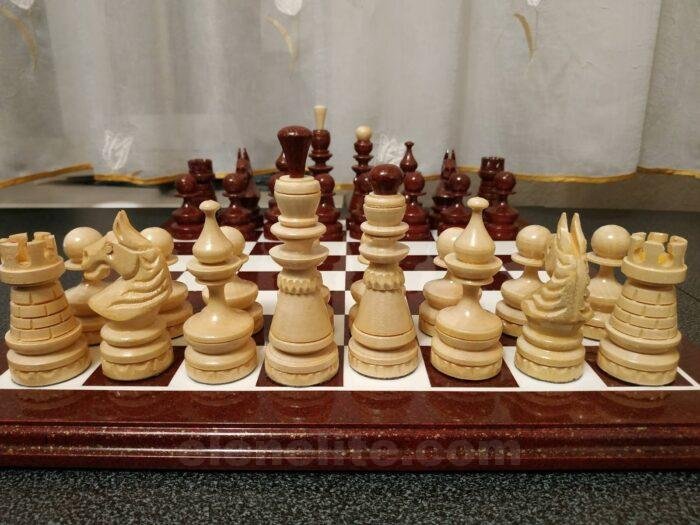 A luxurious chess set, handcrafted from natural ash and maple. The board and pieces are made in a unique design in a rare cherry-brown shade, decorated with gold accents. The super-gloss coating adds depth to the color, creates a mirror-like shine effect and reliably protects the surface from damage. Every detail is thought out and made by hand by craftsmen, which makes this set not just a gaming accessory, but a real work of art.