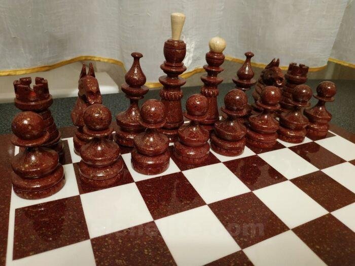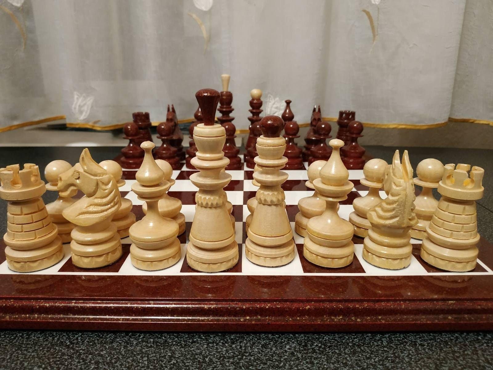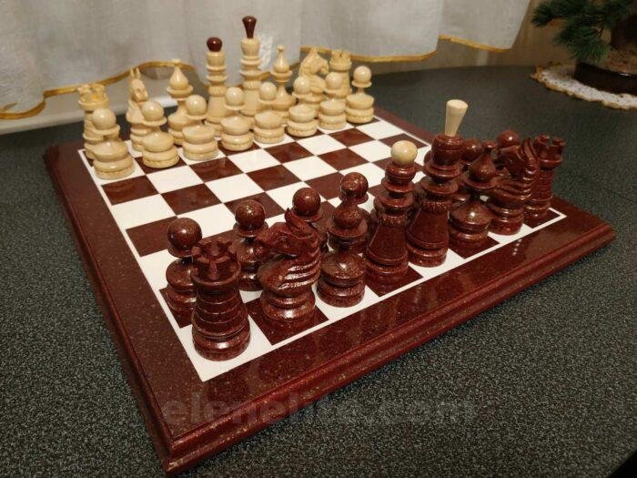 Elegant handmade chess set in rare cherry brown color with gold accents and super glossy finish. Natural wood, premium design and unique style.