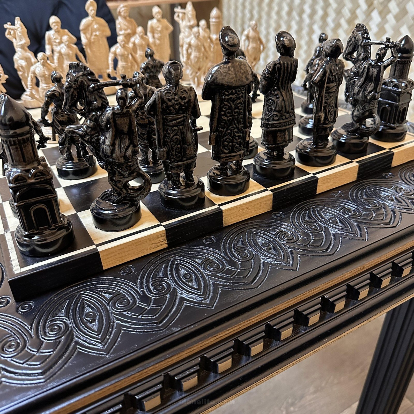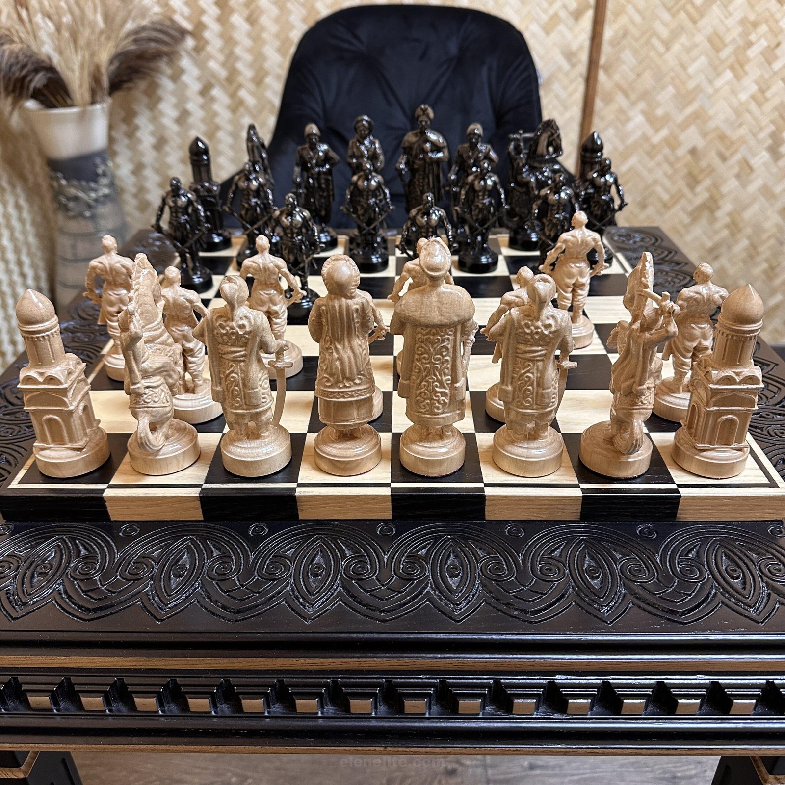DESIGN: the chess board is decorated with carvings; 32 chess pieces – Cossacks; exclusively designed by our “Elen Elite” craftsmen