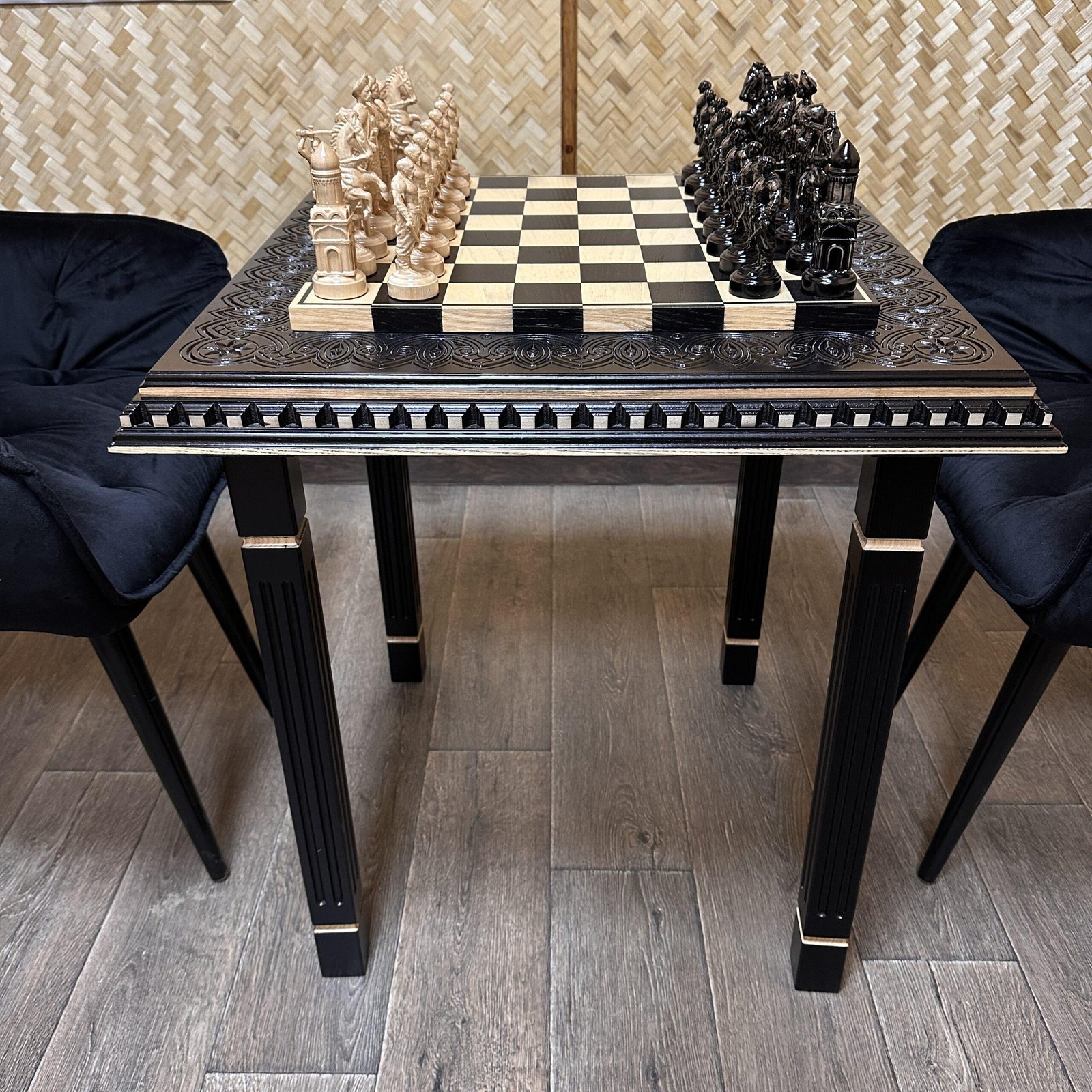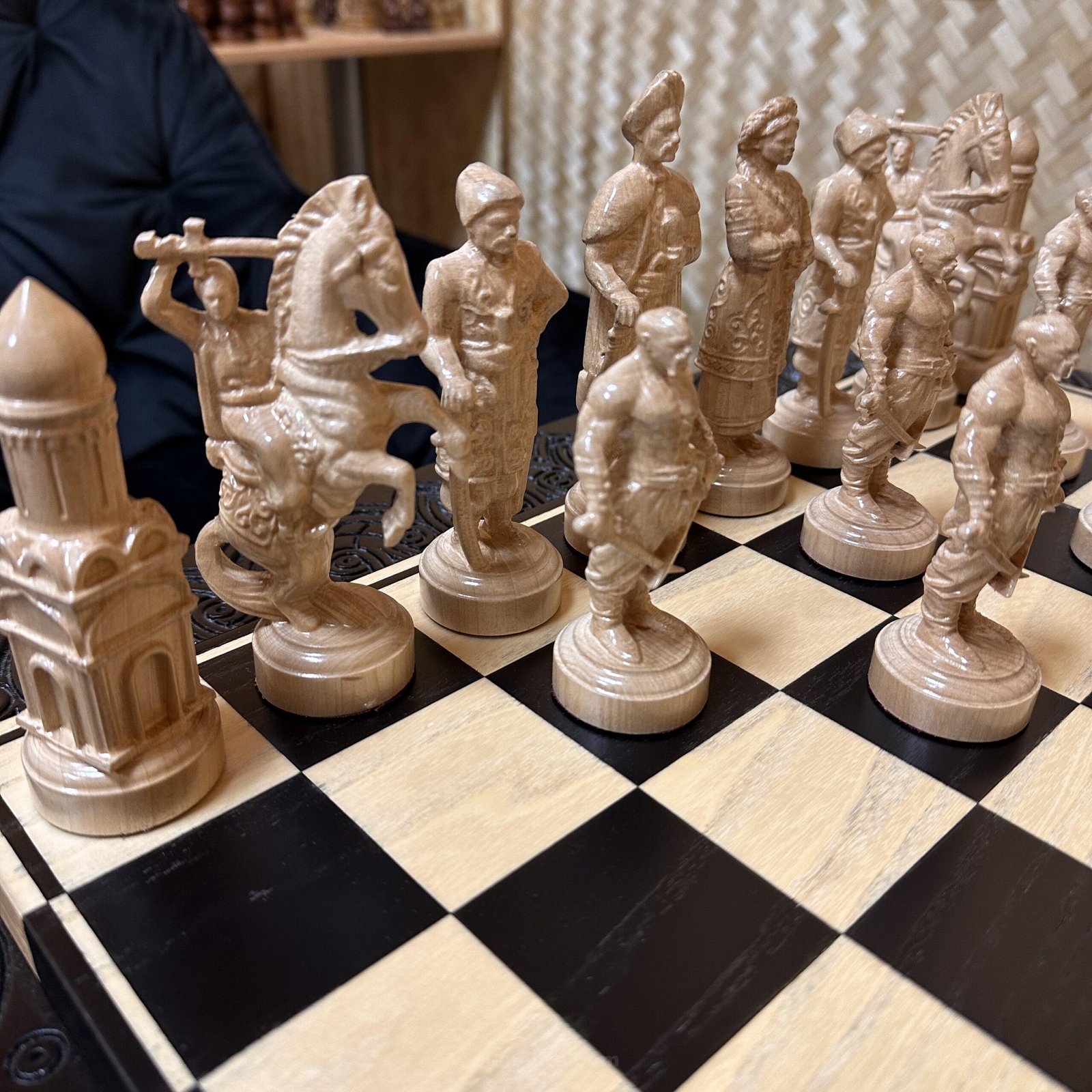 This exclusive chess set combines an elegant natural ash table with unique Ukrainian Cossack figures. The table stands on four carved legs, is finished in black and beige tones, and is adorned with decorative carvings.