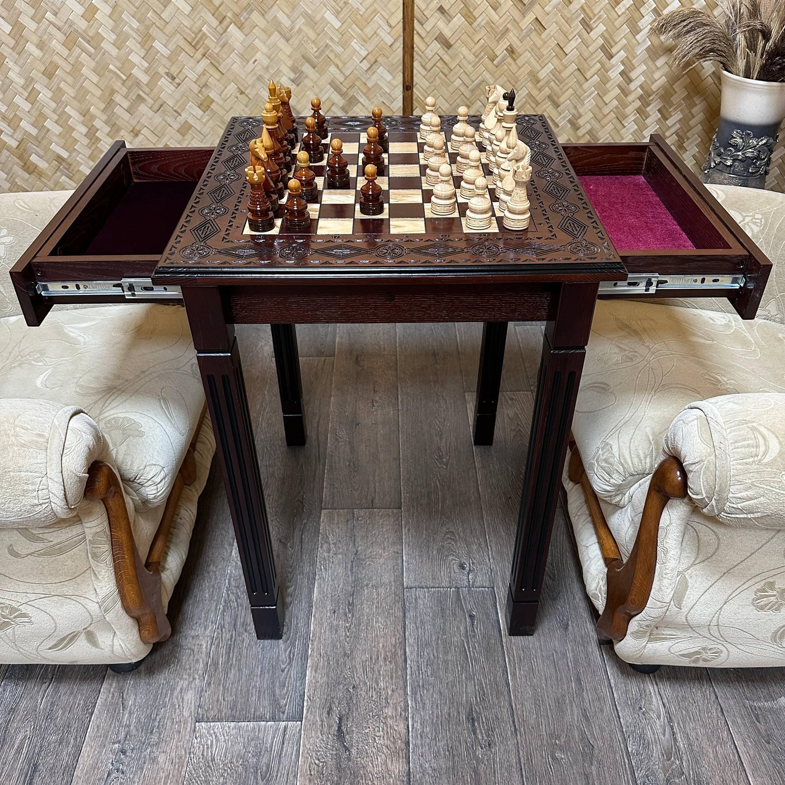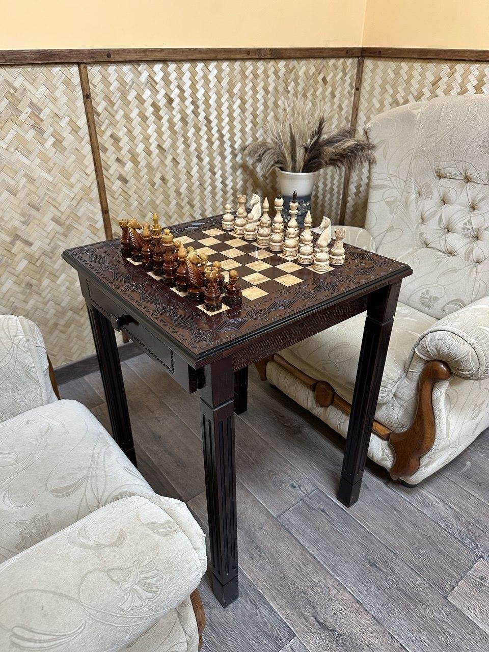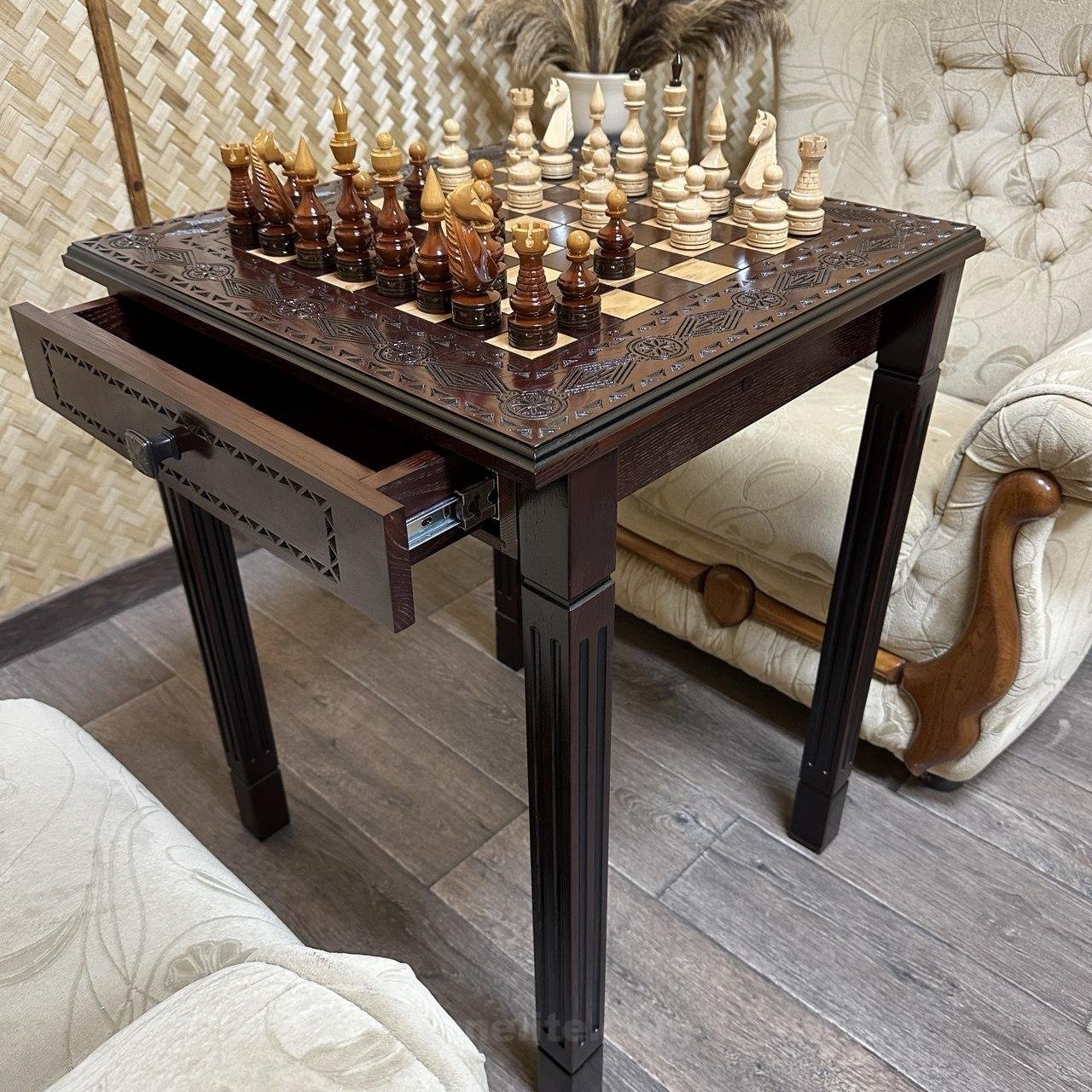 DESIGN: the board is equipped with 2 drawers for storing chess pieces; the chess pieces are made in a classic style; exclusively designed by our “Elen Elite” craftsmen