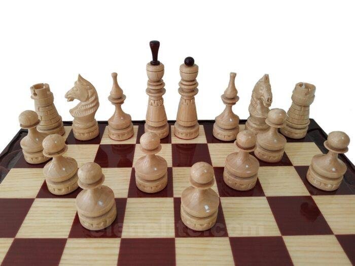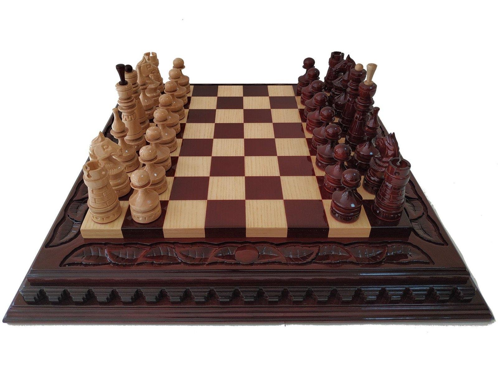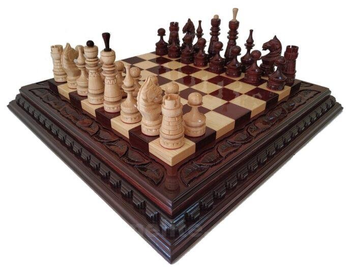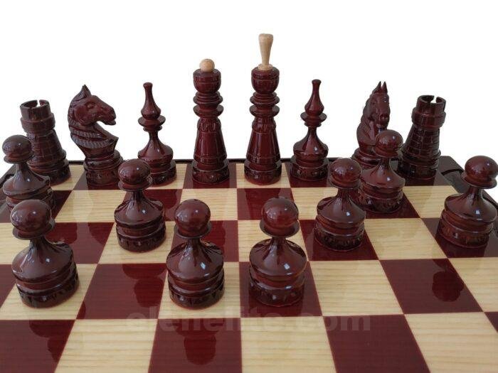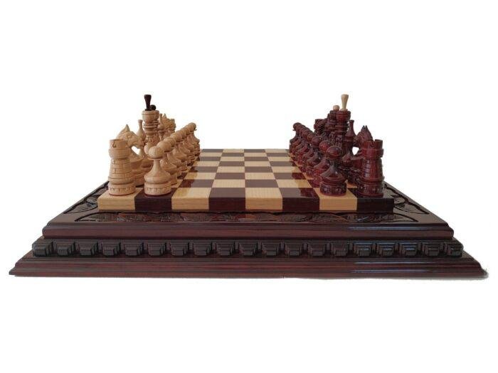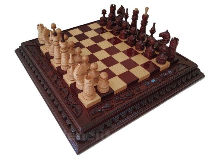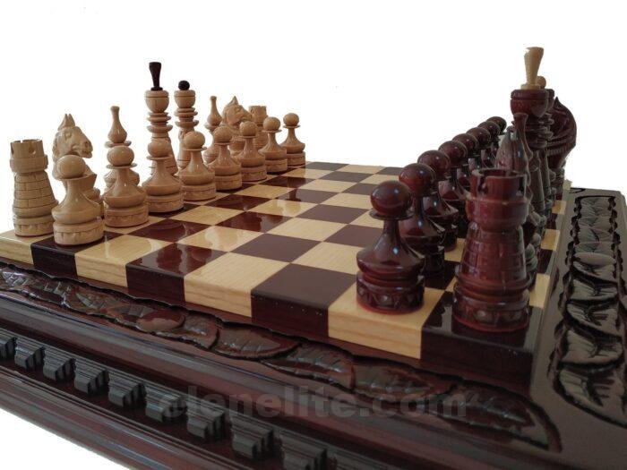 A premium chess set, handcrafted from natural wood. The board is made of ash in an exquisite cherry tone and decorated with fine leaf carvings around the perimeter. The surface is covered with a super glossy varnish, which gives the product a mirror shine and protects it from damage. The pieces, carved from maple, are made in the same color and also covered with a glossy varnish, providing an impeccable appearance and additional durability.