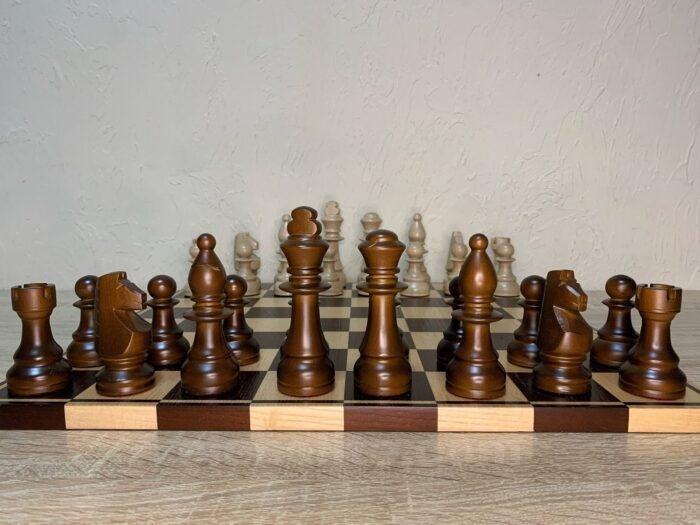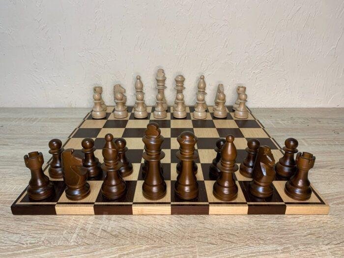 This chess set is a harmonious combination of design, materials and color. The chess board is handcrafted from ash and decorated in classic brown and beige tones, emphasizing the natural texture of the wood. The chess pieces are made of maple and painted in similar shades, which makes them a perfect match for the board.