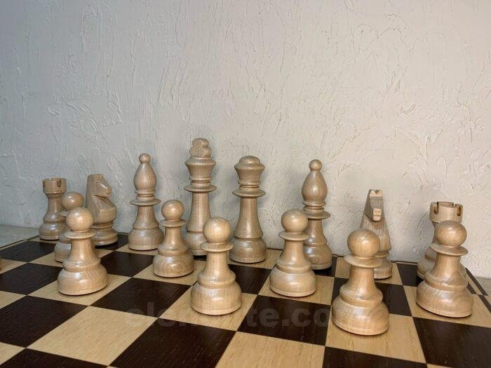 A classic chess set with perfectly matched elements. The chess board is made of ash in brown-beige tones, with a natural wood texture. The figures, made in the same tones, harmoniously complement the board.