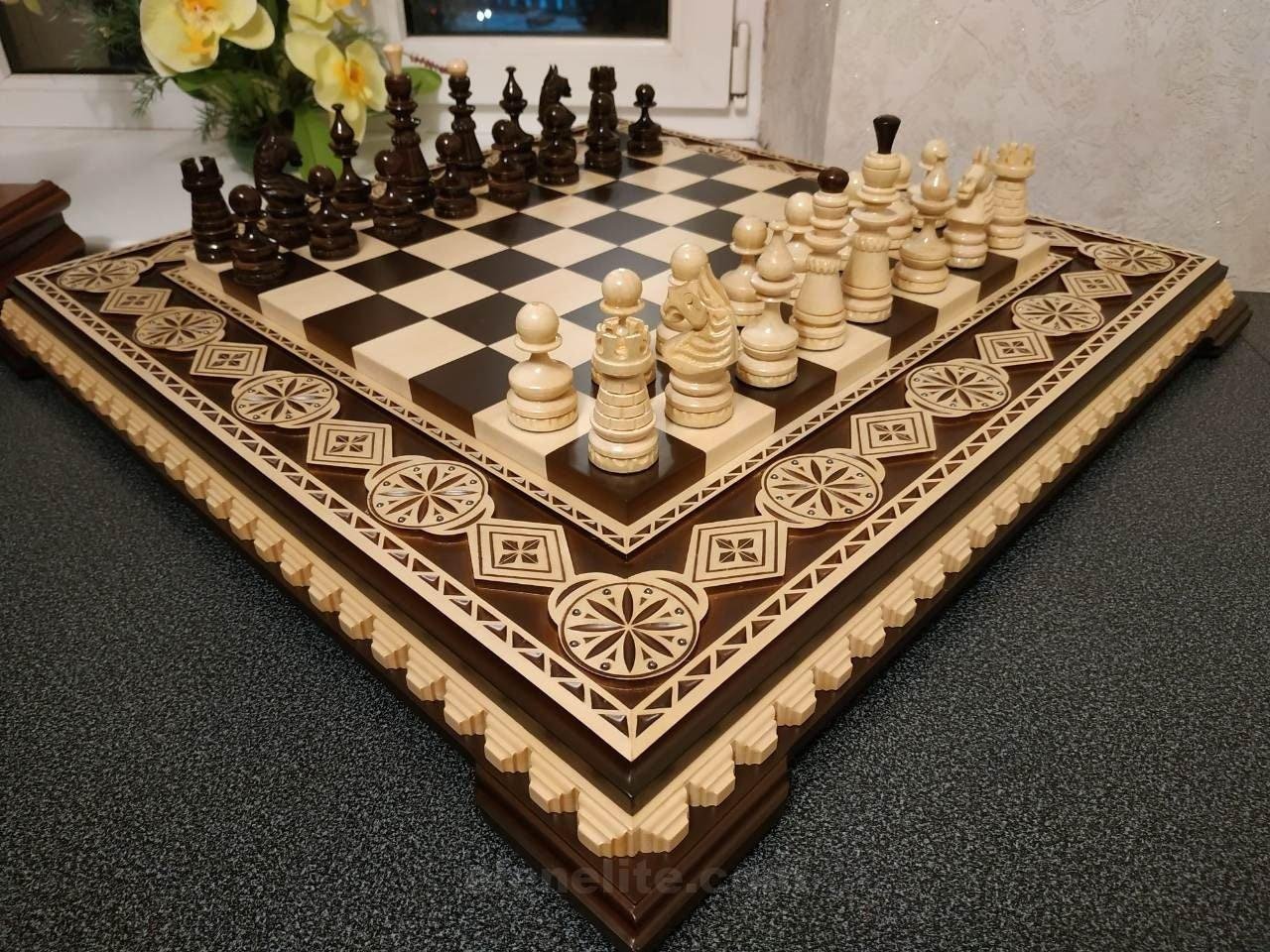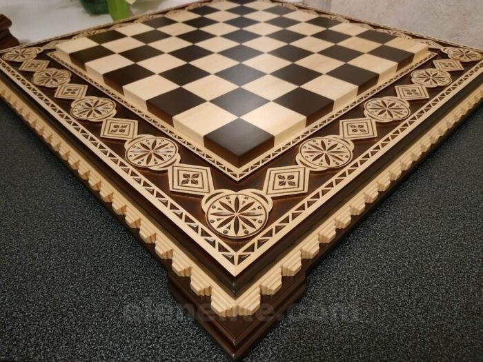 An elegant chess set, handmade from natural materials. The chess board is made of ash, painted in a rich dark brown color and decorated with light carvings along the edges, emphasizing the shape and style. An additional decorative element – bead inlay – gives the product a unique and expressive look.