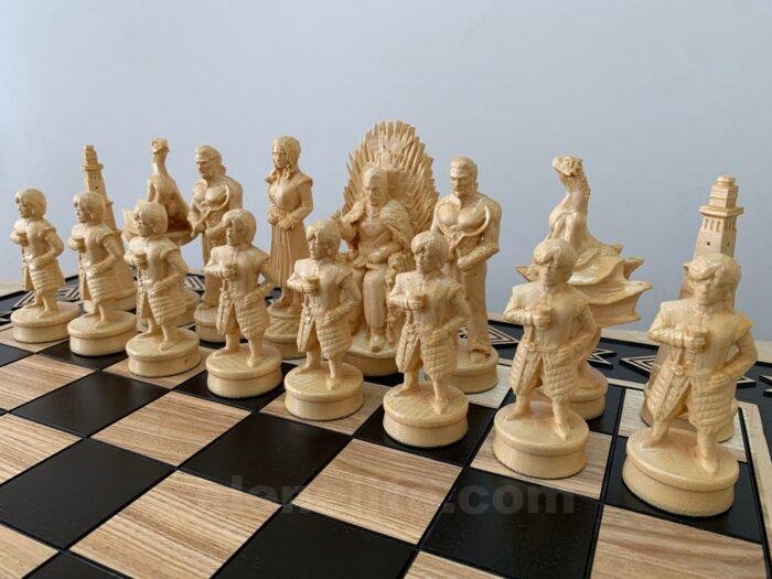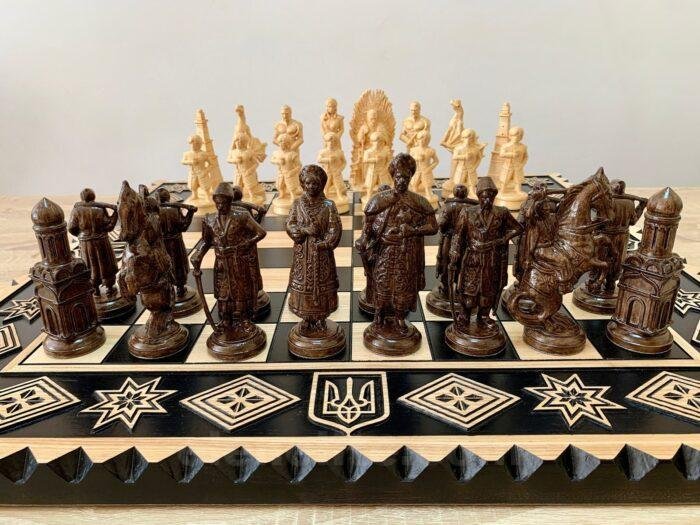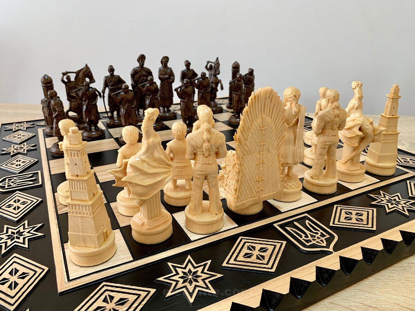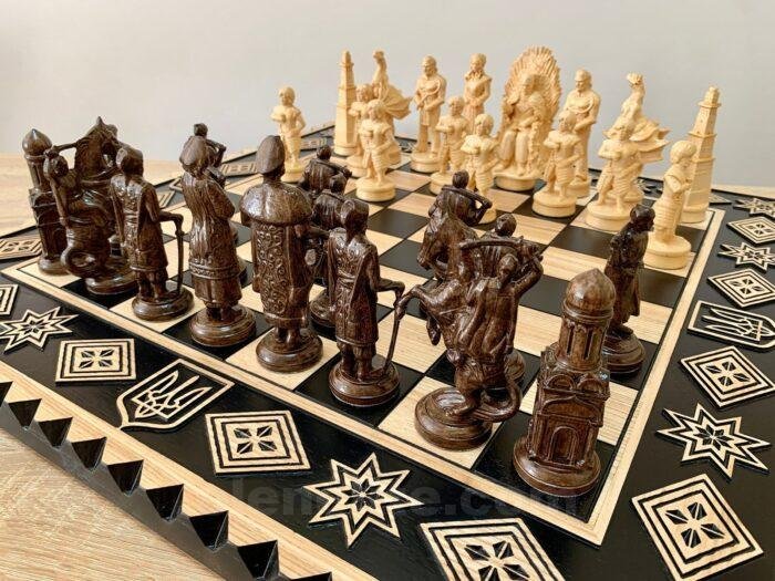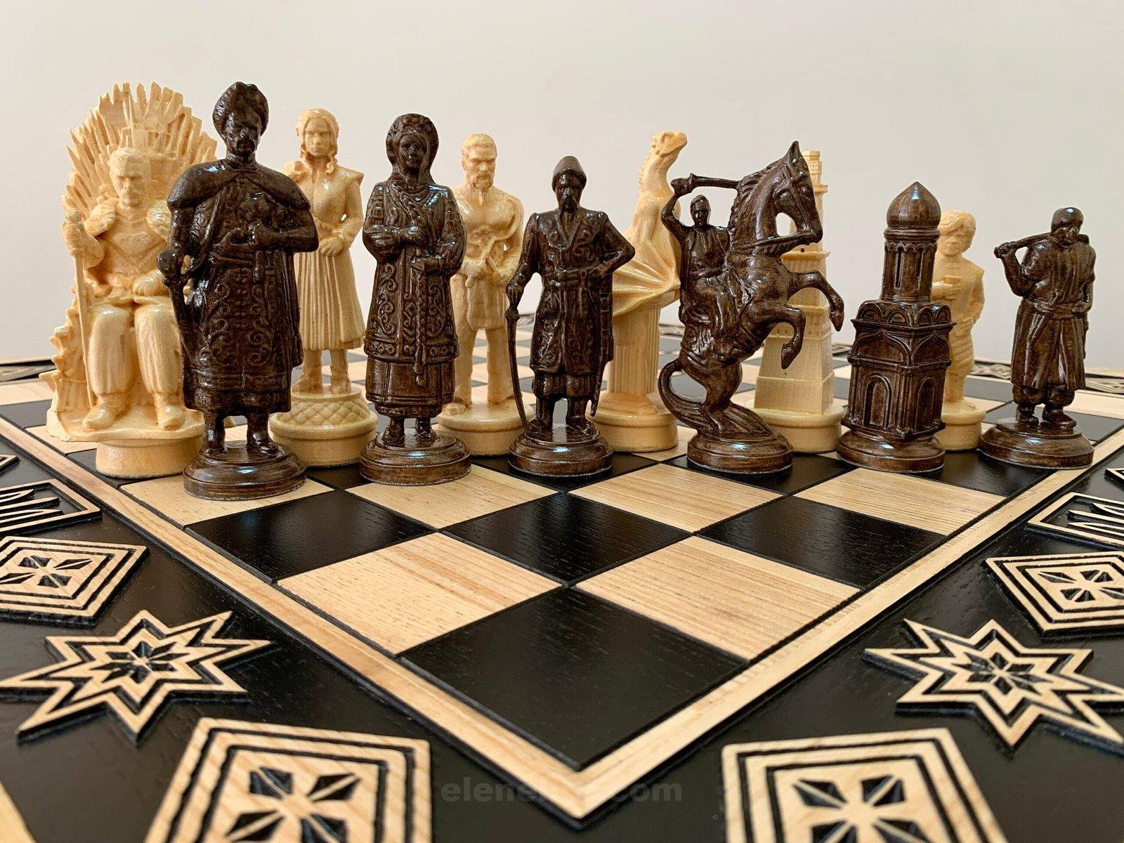 Handcrafted chess set with an ash board decorated with carvings inspired by Ukrainian culture – the eight-pointed star of life and the coat of arms of Ukraine. The set includes 16 pieces in the form of characters from the series Game of Thrones and 16 pieces in the form of Ukrainian Cossacks.