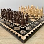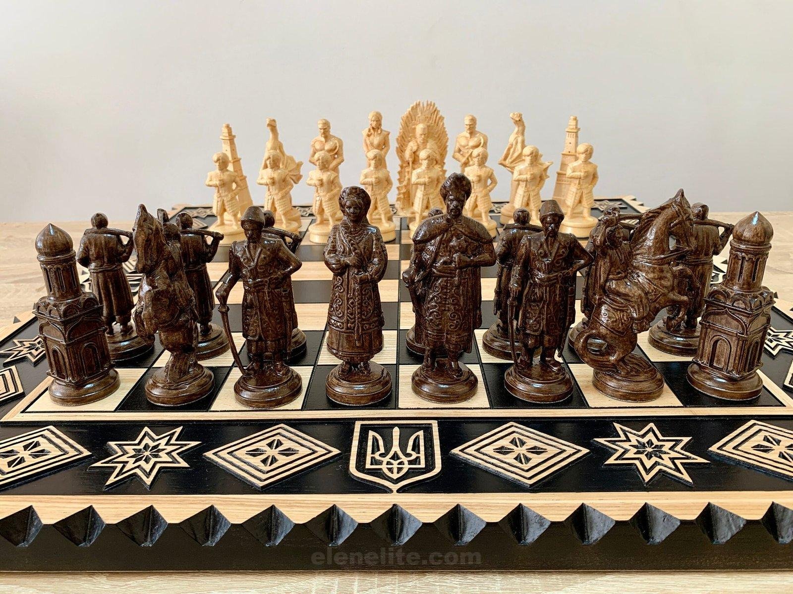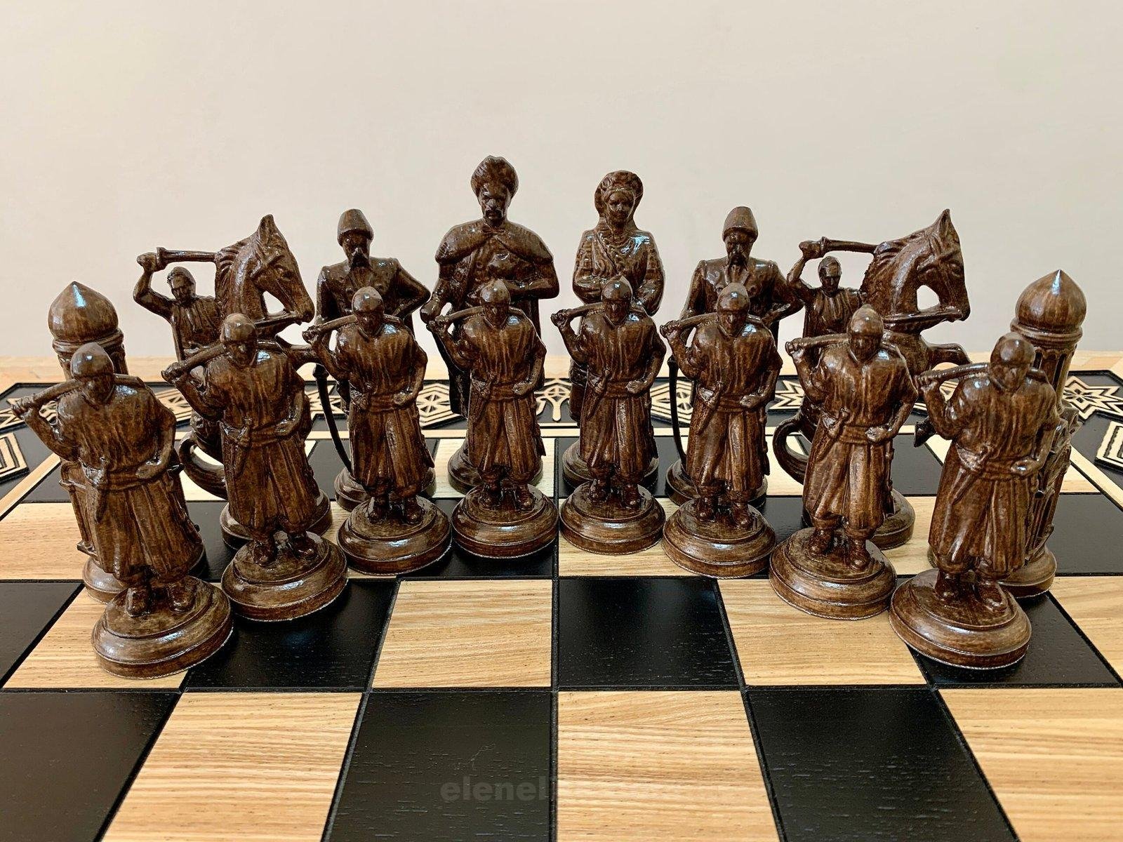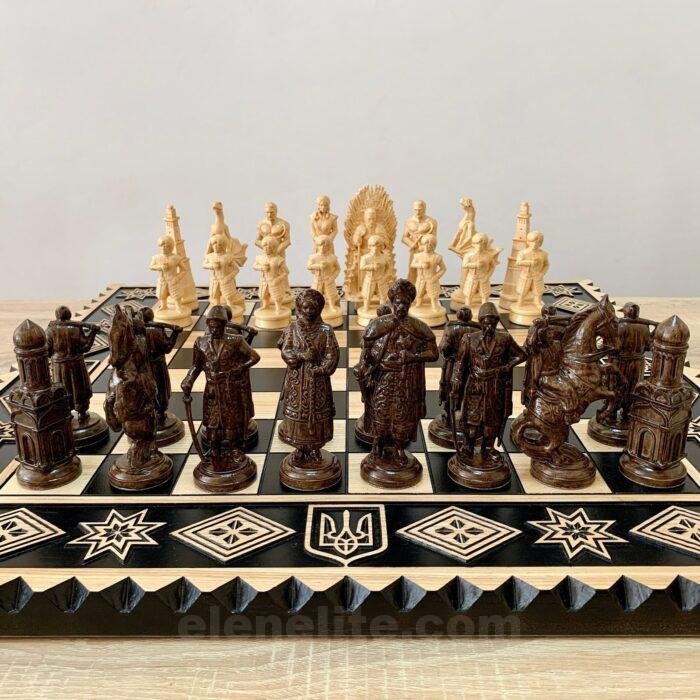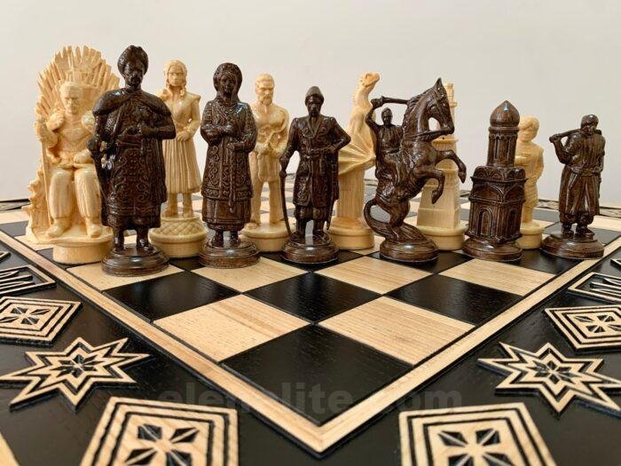 DESIGN: the board is decorated with carved patterns of eight-pointed stars and Ukrainian symbols; 16 pieces – characters from the series “Game of Thrones” and 16 pieces – Ukrainian Cossacks; exclusively designed by our “Elen Elite” craftsmen.
