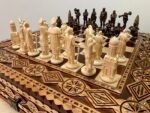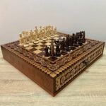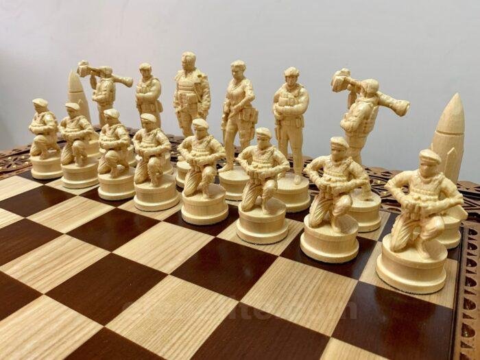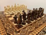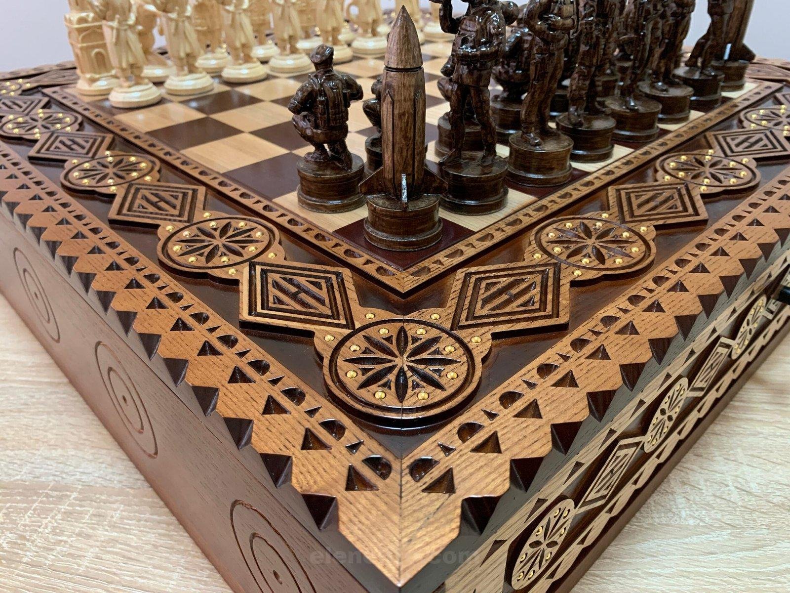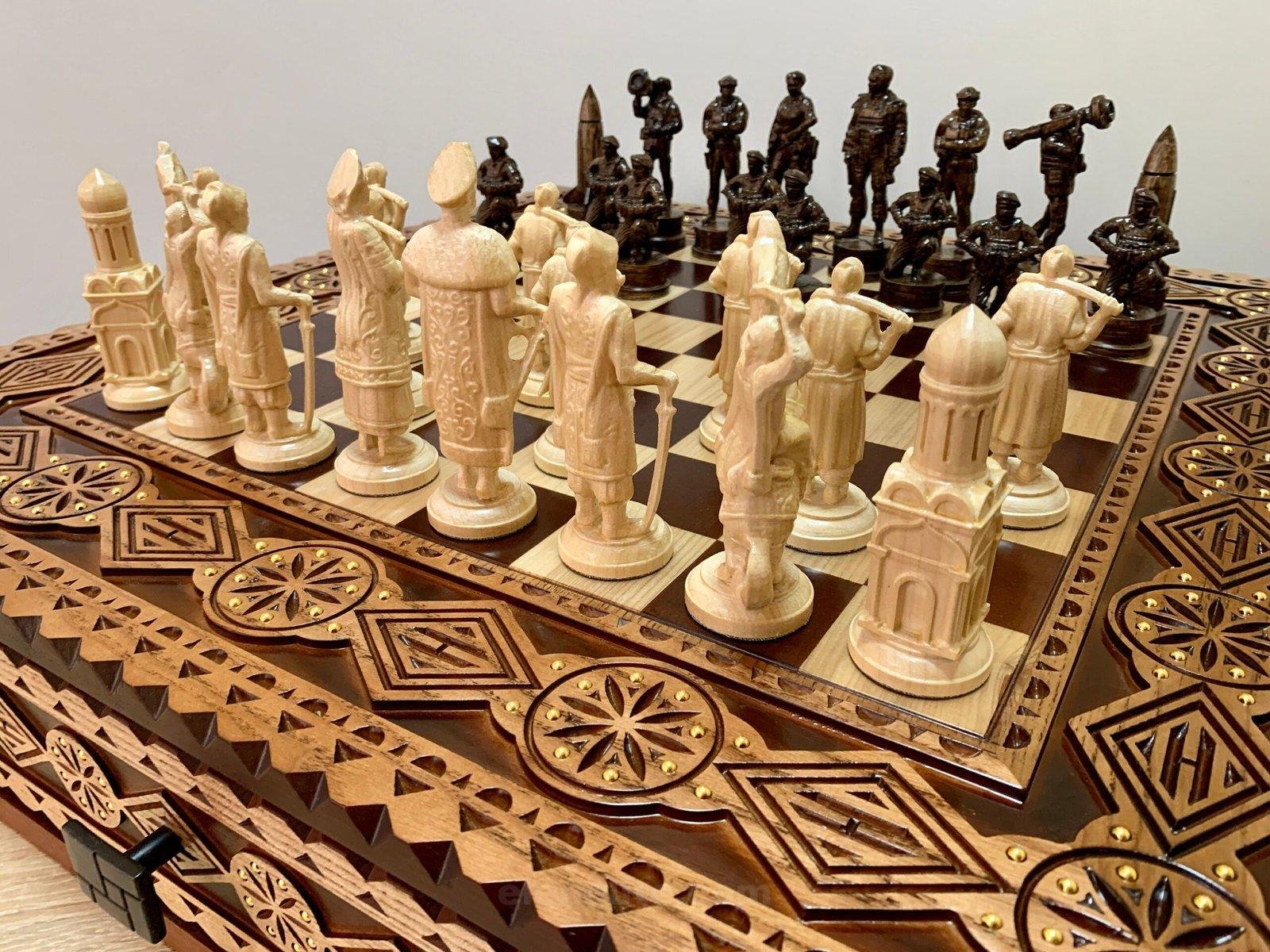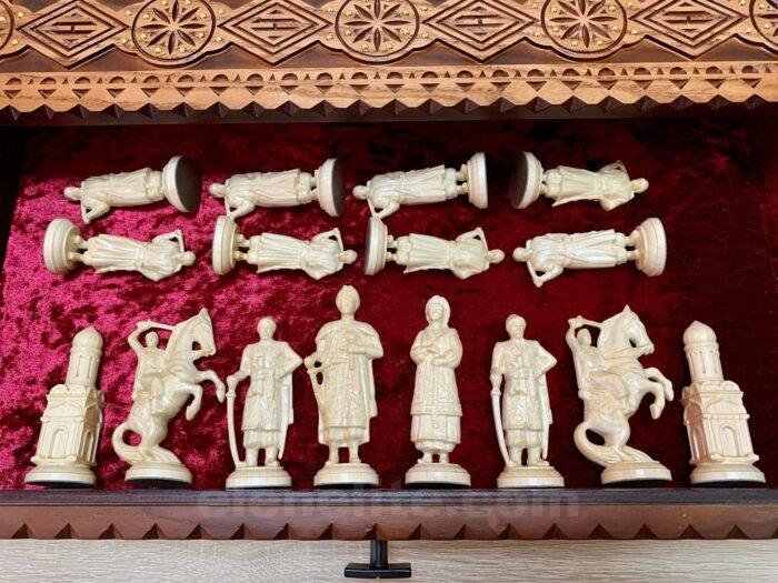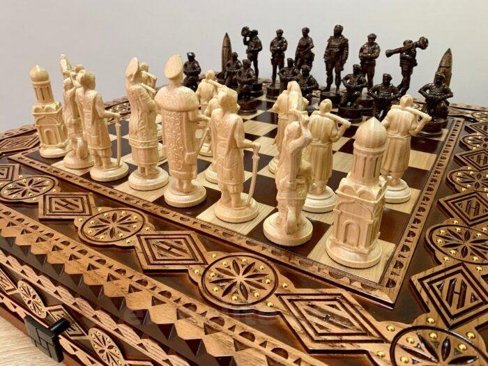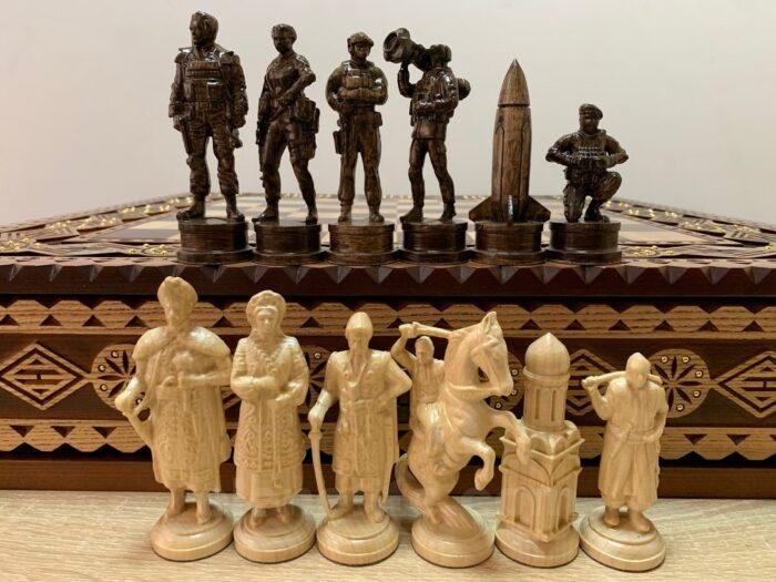This chess set is a true work of art, combining deep national flavor and the highest craftsmanship. The board is made of selected ash, made in a warm brown color, decorated with elegant carving and inlaid with beads. Two drawers with premium fittings and a soft velvet lining provide reliable storage of the pieces. The set includes 32 unique chess pieces with detailed elaboration of clothing, weapons and facial features: 16 pieces depict Ukrainian Cossacks led by the ataman, and 16 – warriors of the Ukrainian Armed Forces, among whom the king is the poet Taras Shevchenko and the queen is Lesya Ukrainka.