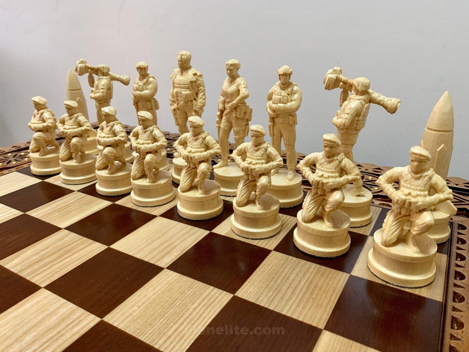 DESIGN: the chess board is equipped with 2 drawers for storing chess pieces and is inlaid with a beads; 16 pieces – Ukrainian heroes: Taras Shevchenko, Lesya Ukrainka, military and 16 pieces – Ukrainian Cossacks; exclusively designed by our “Elen Elite” craftsmen.