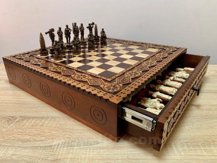 Wooden Chess Set: Board "The Art of a Winner" with 2 Drawers + Chess pieces “Armed Forces of Ukraine” / “Cossacks”