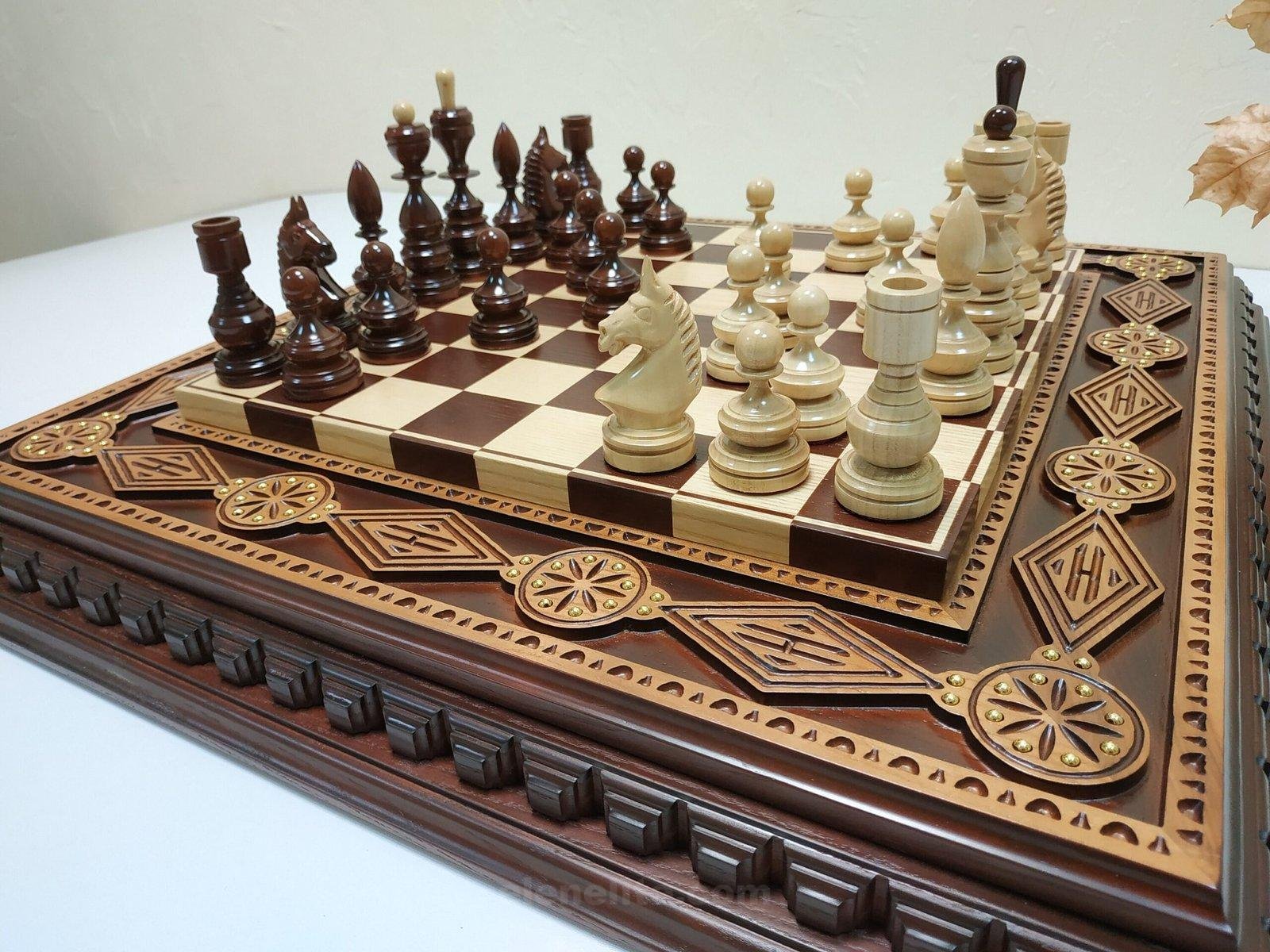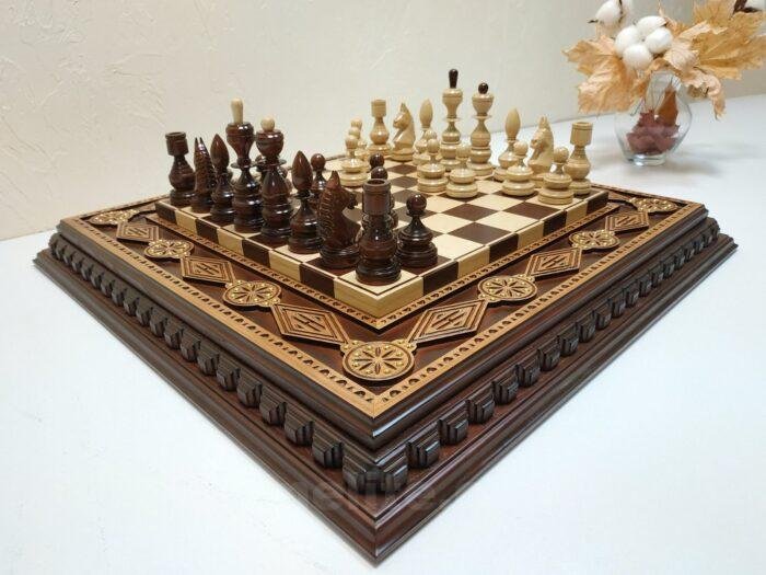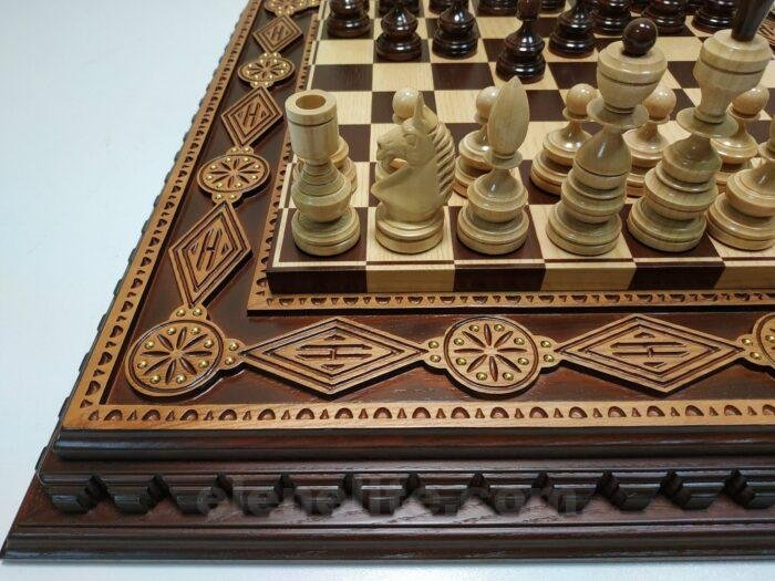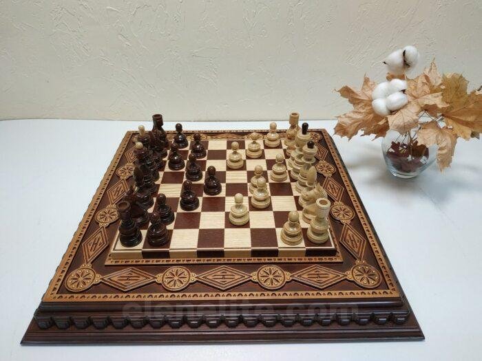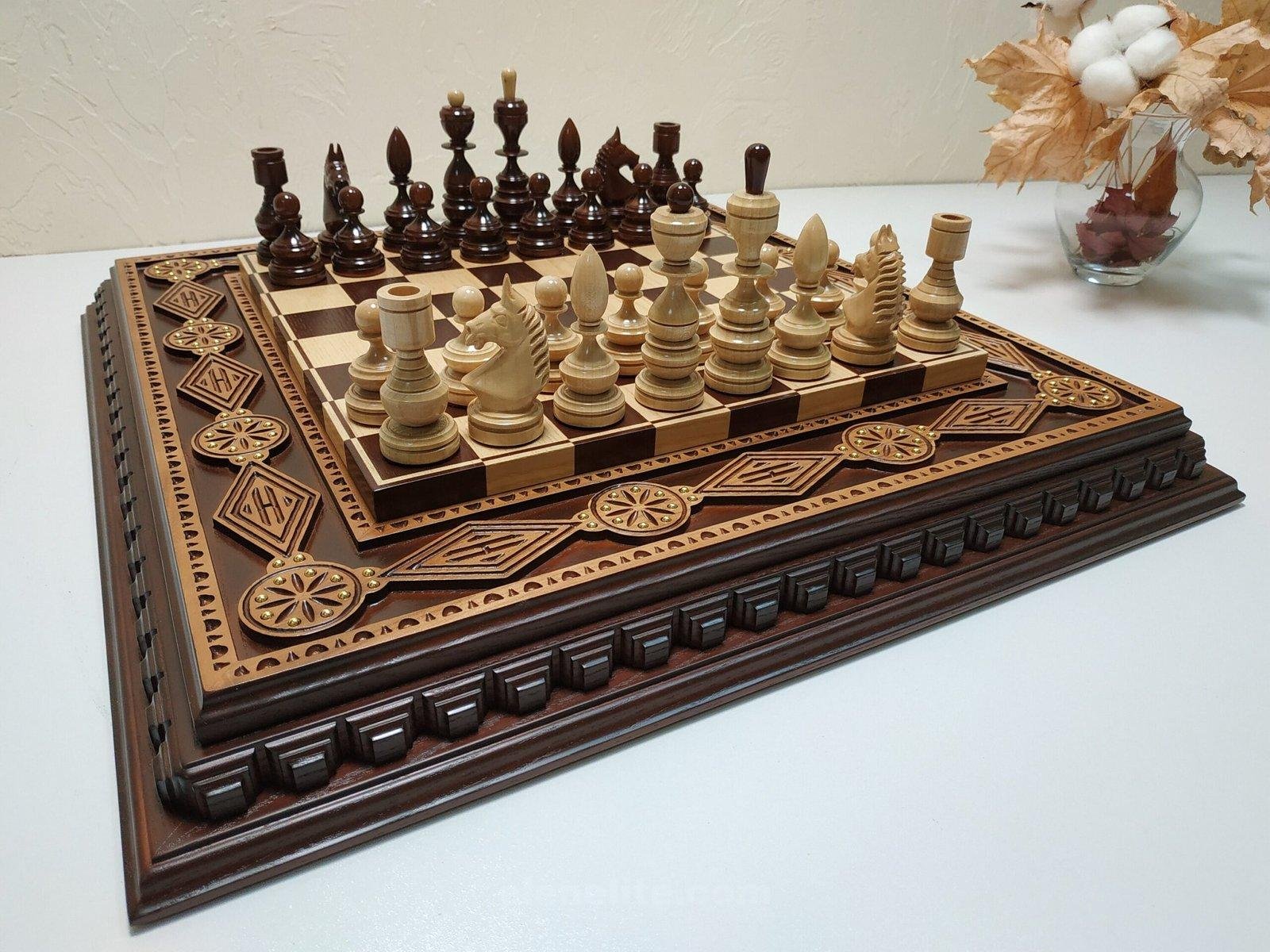 Classic chess set: carved ash board with decorative elements and handmade “Classic Deluxe” chess pieces made of natural maple. An elegant choice for connoisseurs of style and quality.