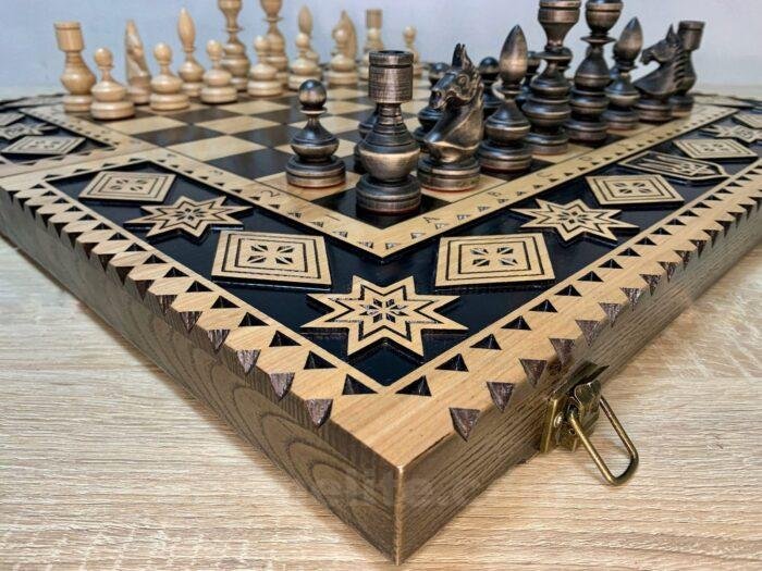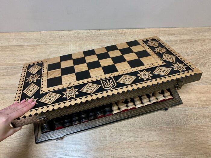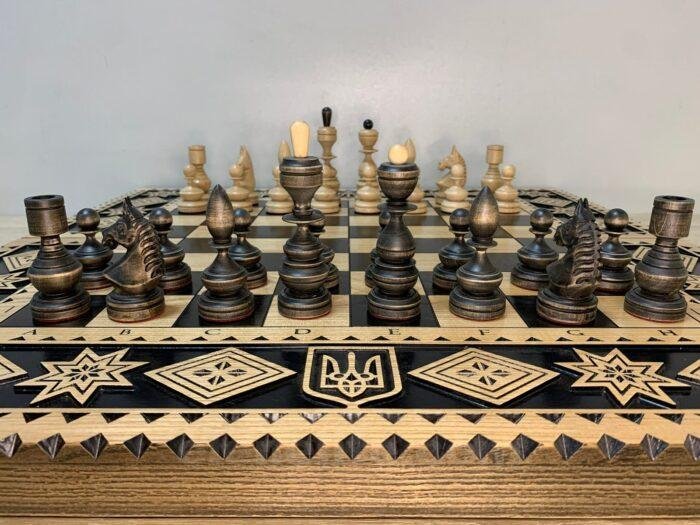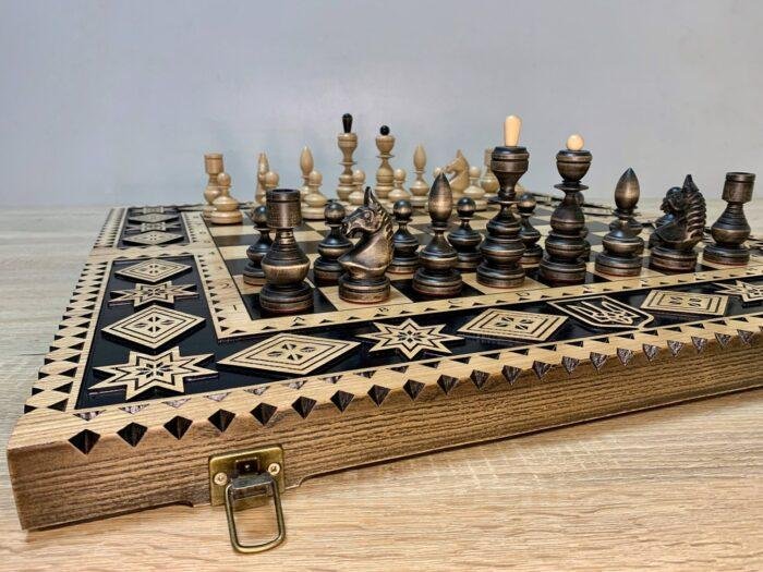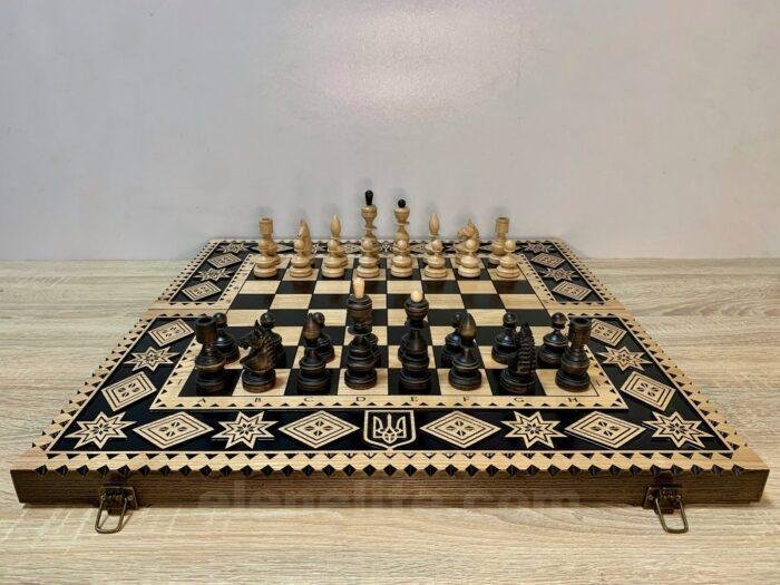 DESIGN: folding board with velour storage, carved patterns of eight-pointed stars and Ukrainian Trident; the chess pieces are made in a classic design; exclusively designed by our “Elen Elite” craftsmen.