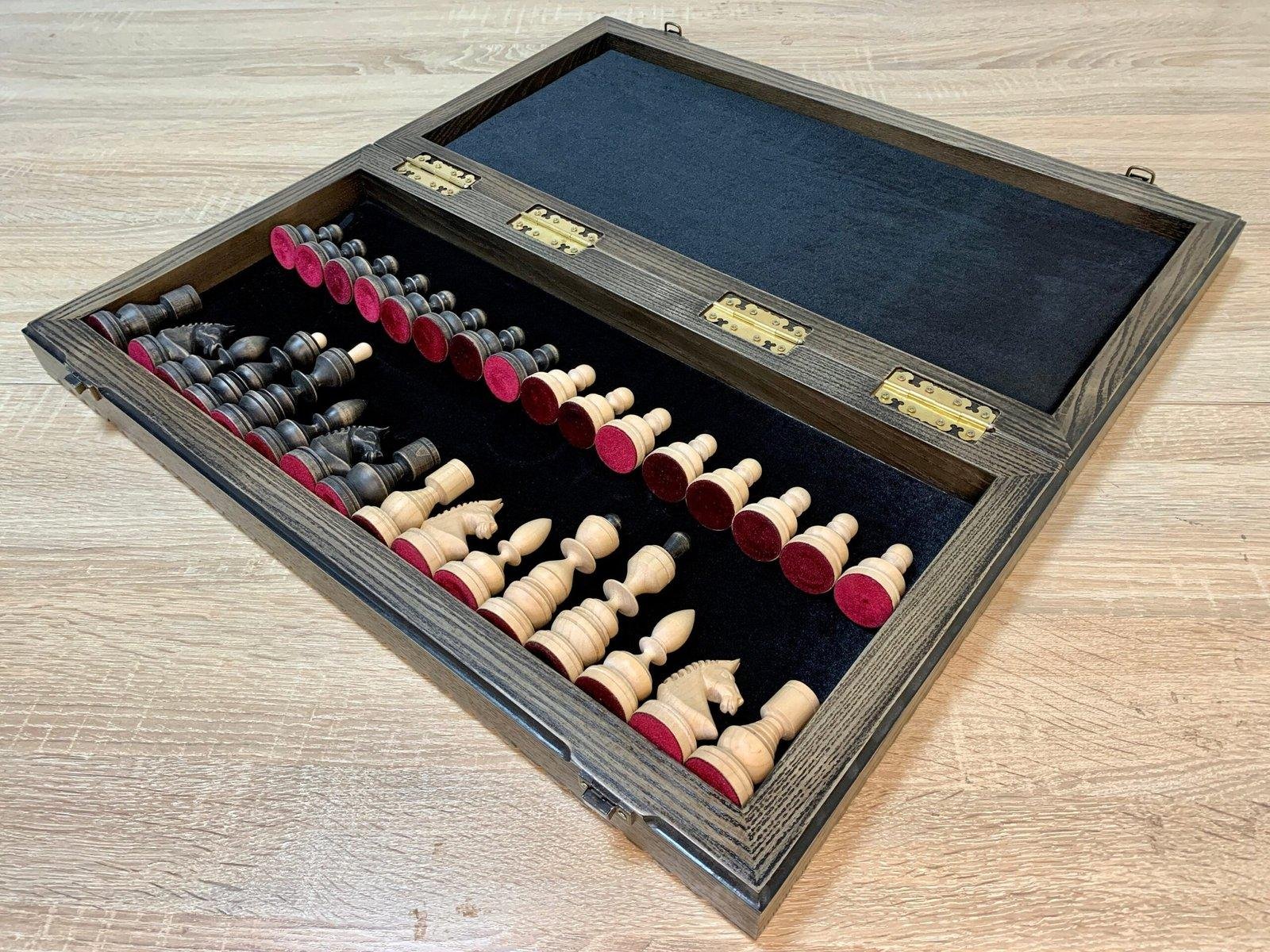 MATERIAL: chess board – solid ash wood; chess pieces – maple wood; each chess piece has a velvet backing for easy sliding on the board and protection from scratches