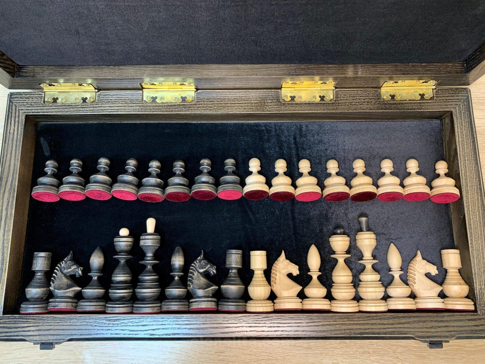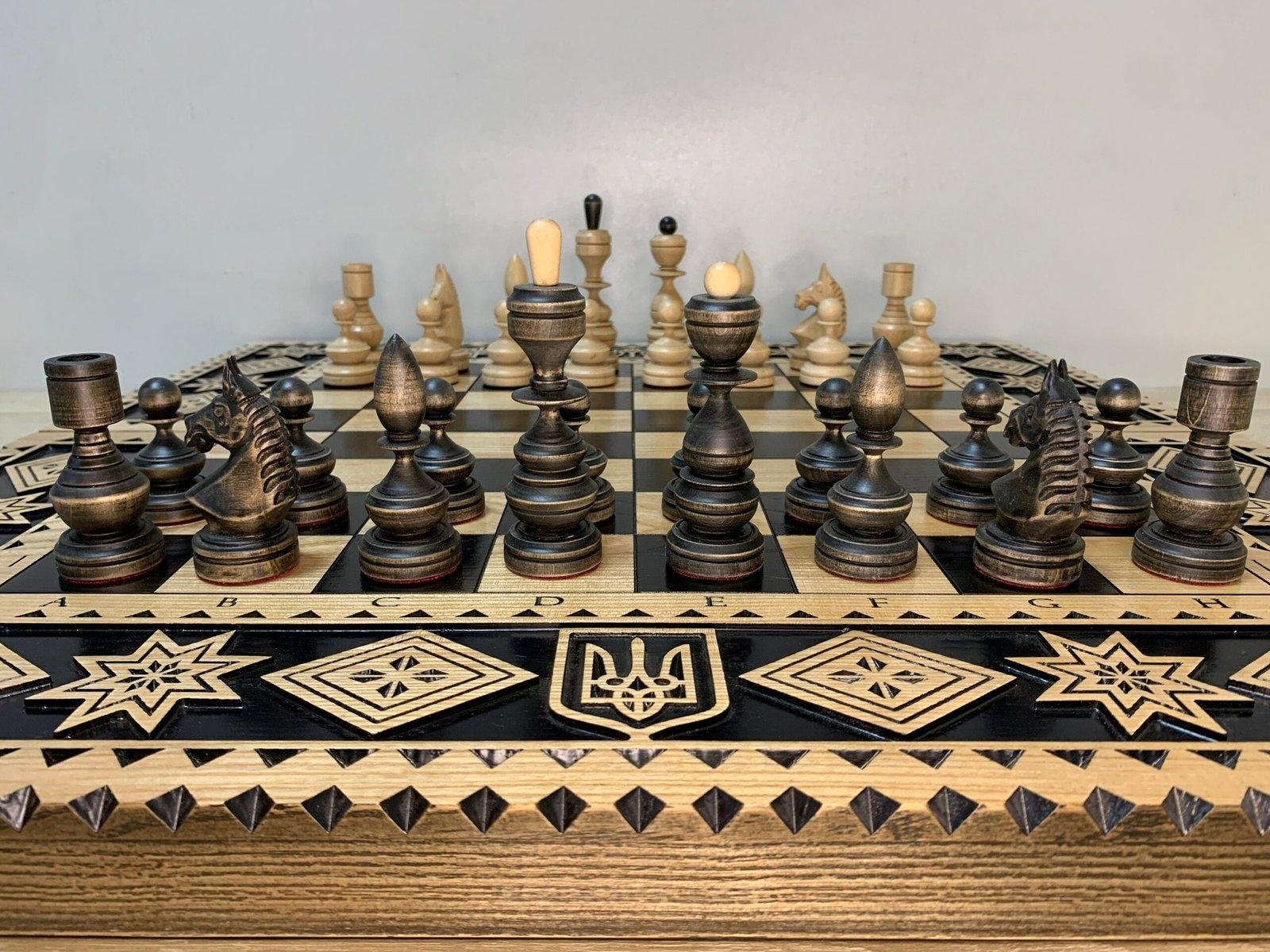 A luxurious chess set with a folding ash board with carvings and Ukrainian symbols, classic maple pieces – style and quality in every detail.
