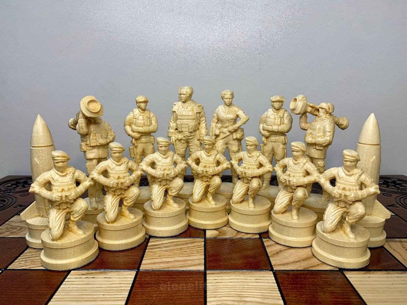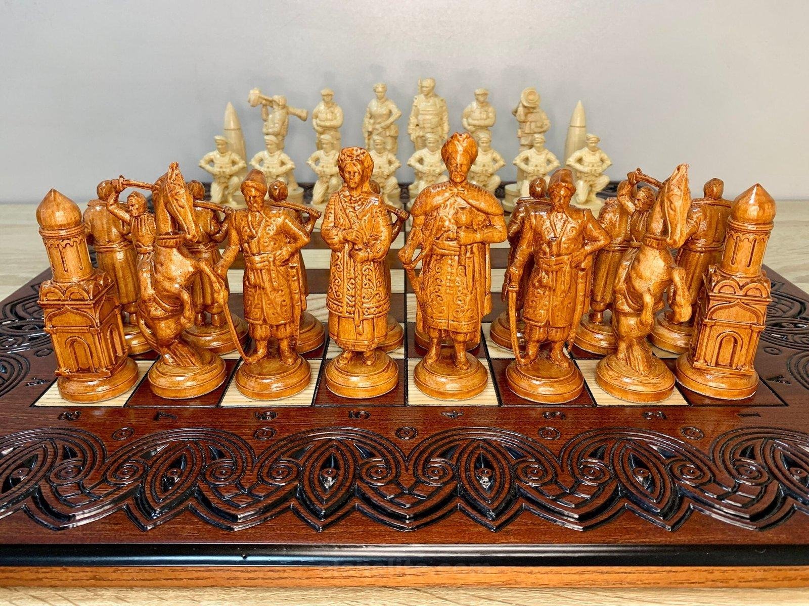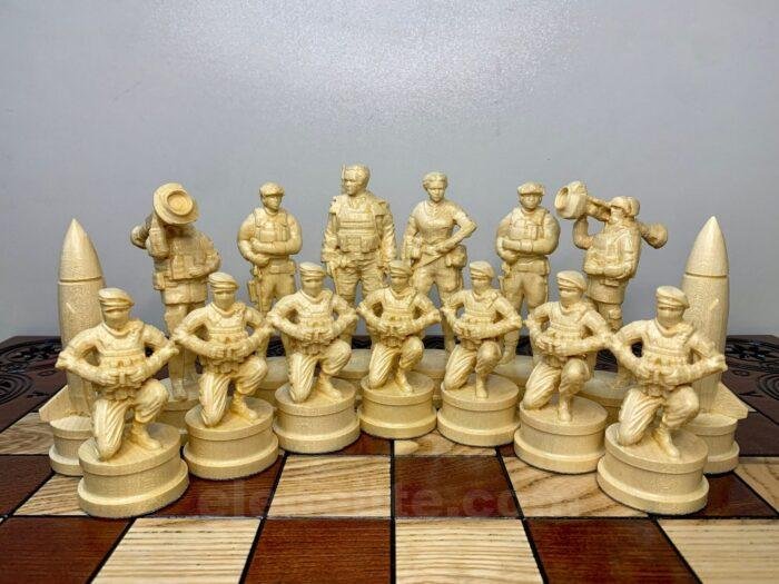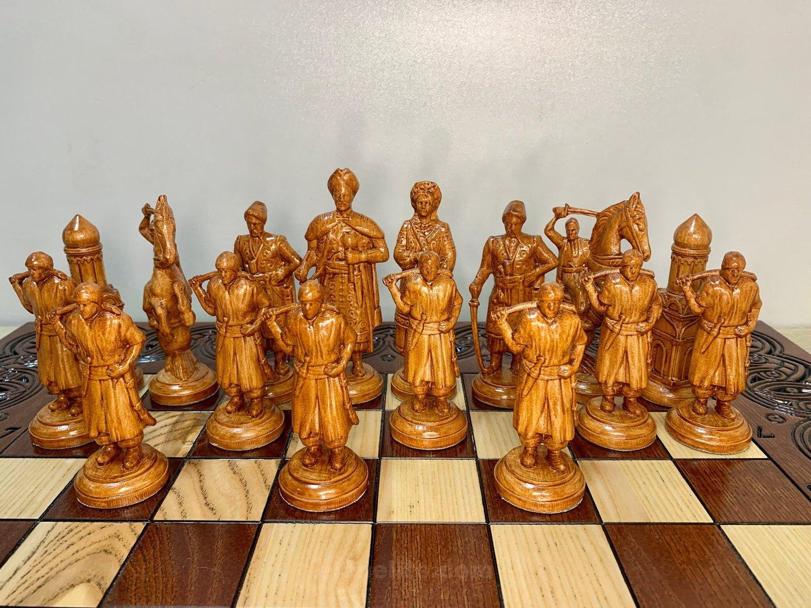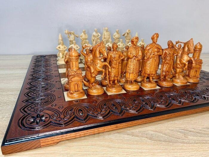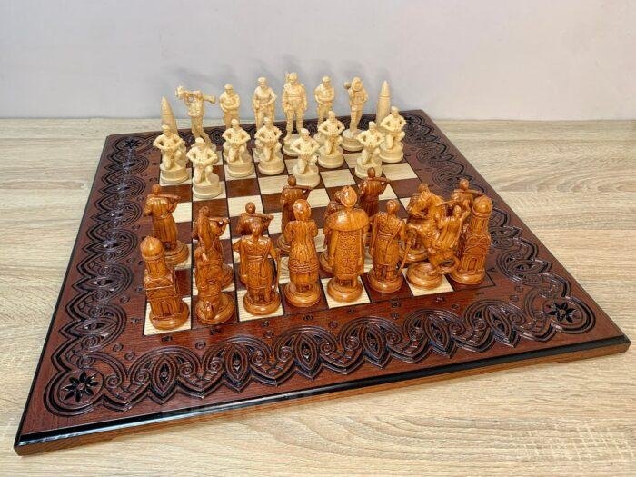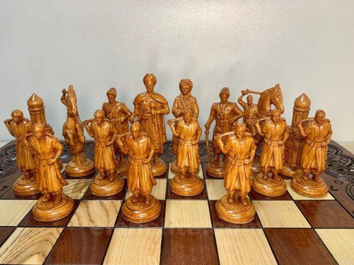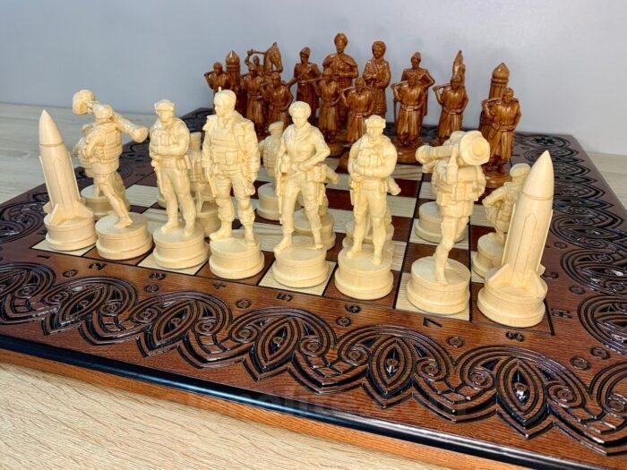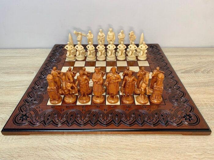 A chess set with a carved ash board and unique pieces “Cossacks” and “Armed Forces of Ukraine”. The king is Taras Shevchenko, the queen is Lesya Ukrainka. History, culture and patriotism in every detail.