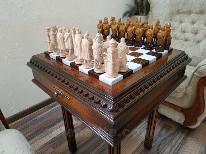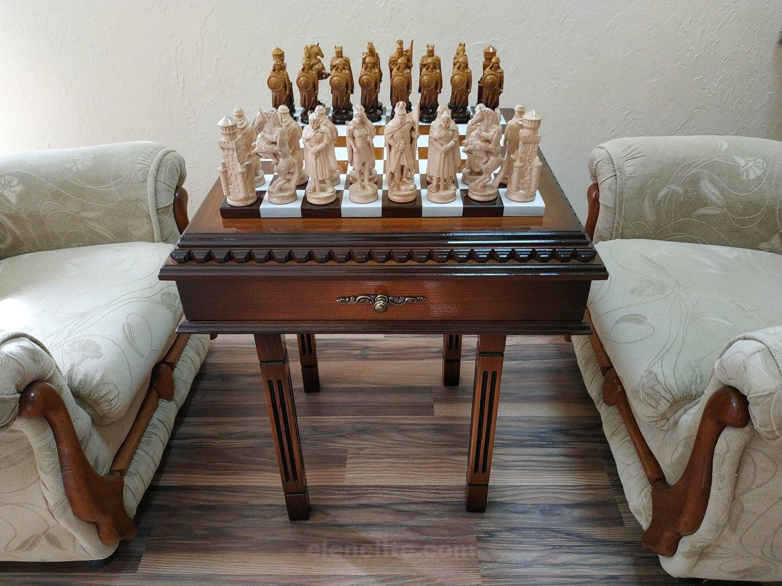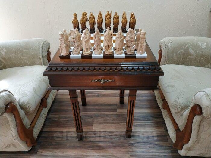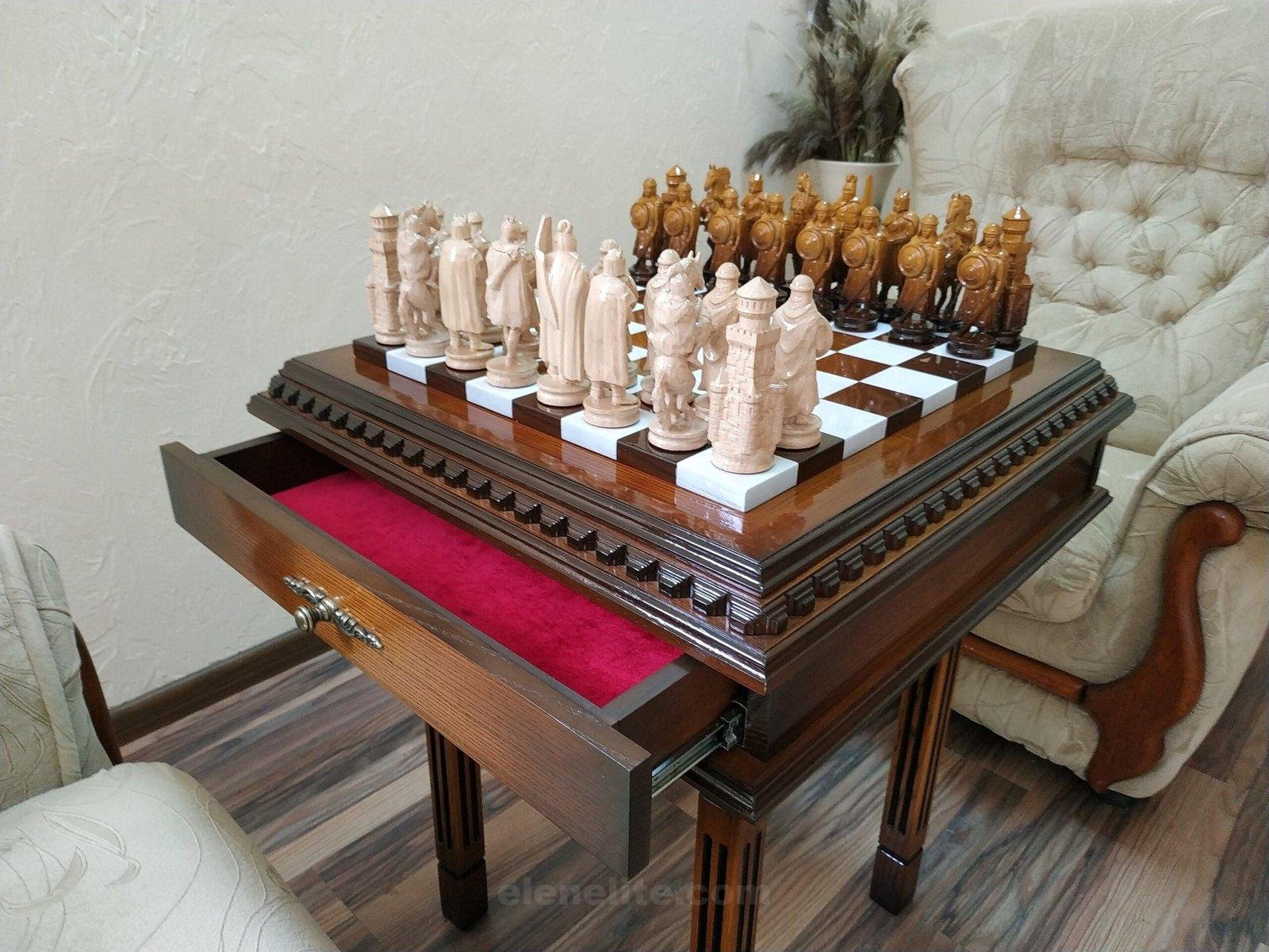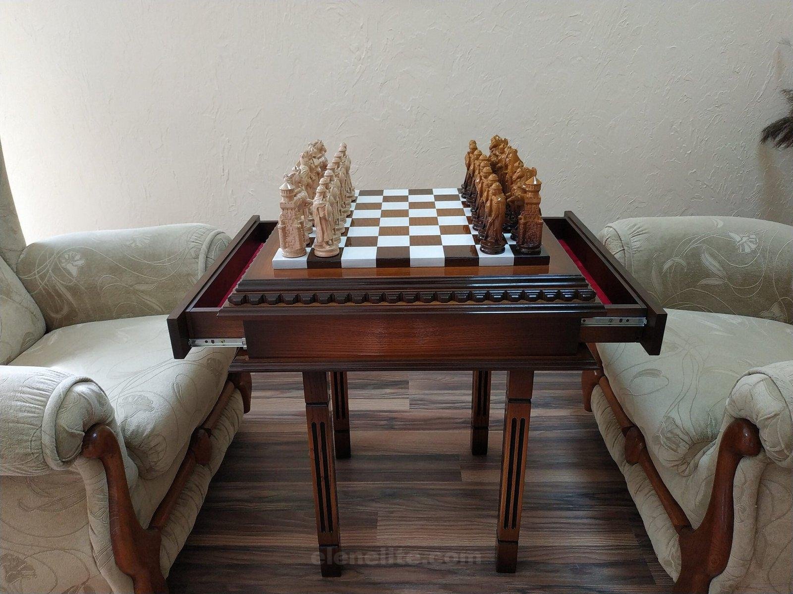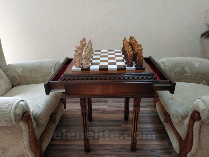 DESIGN: the board is equipped with 2 drawers for storing chess pieces; 32 chess pieces – Knights; exclusively designed by our “Elen Elite” craftsmen