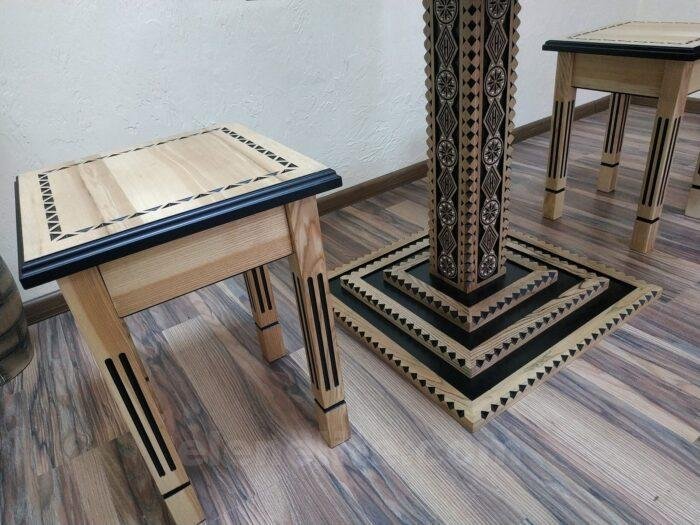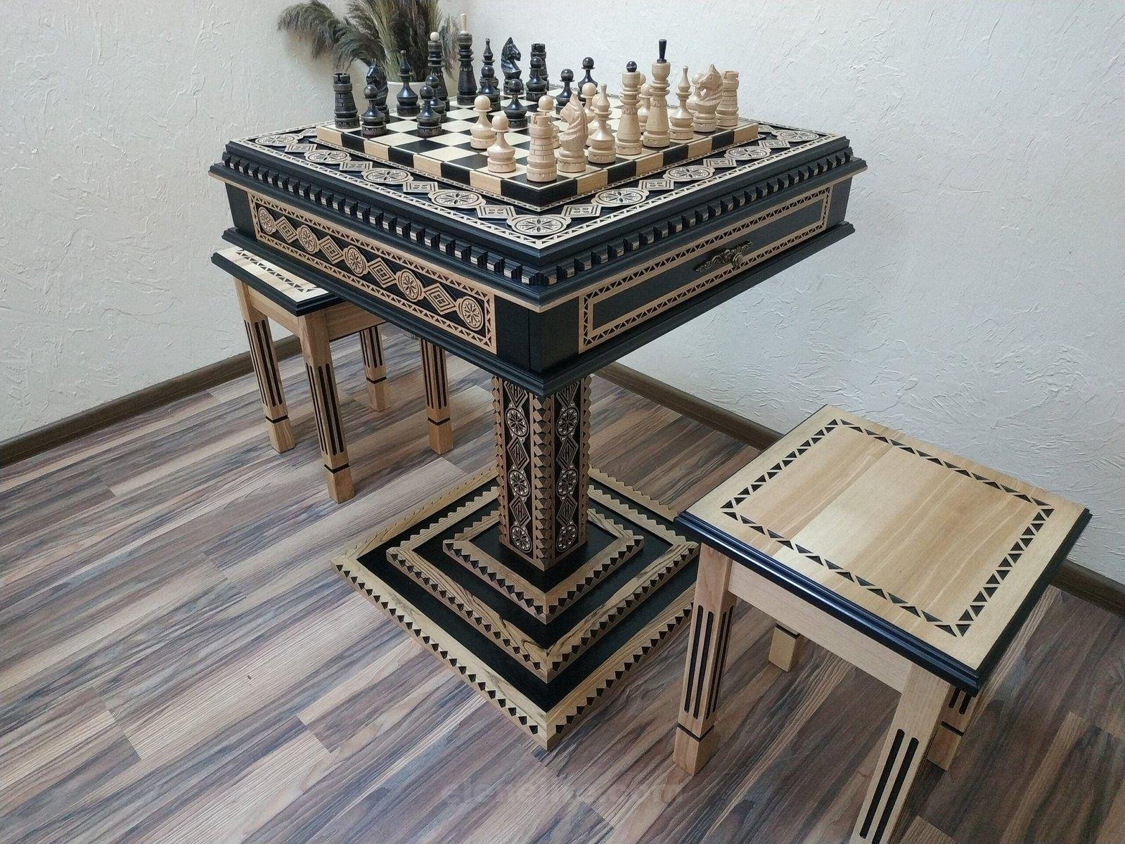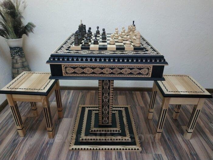 A luxurious set for true connoisseurs: a table with carvings and inlays, comfortable stools and elegant chess in a classic style.