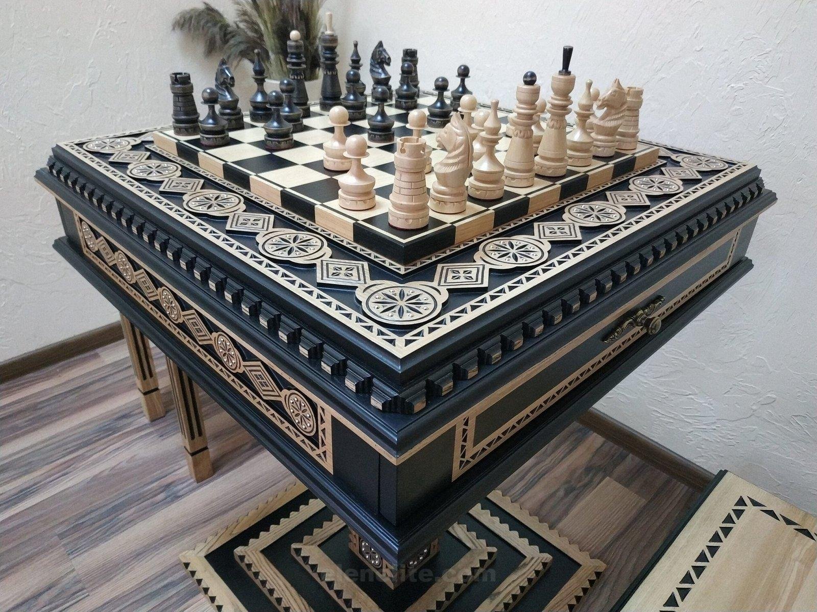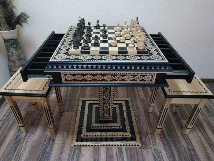 This chess set is designed for those who value luxury and attention to detail. The black ash table with fine carving and beaded inlay turns the game into an aesthetic pleasure. Two velvet drawers with cells for each piece maintain order and emphasize the exclusivity of the set. The set is complemented by two stylish stools and classic hand-made pieces. This set will become the center of attention in your home and a symbol of exquisite taste.