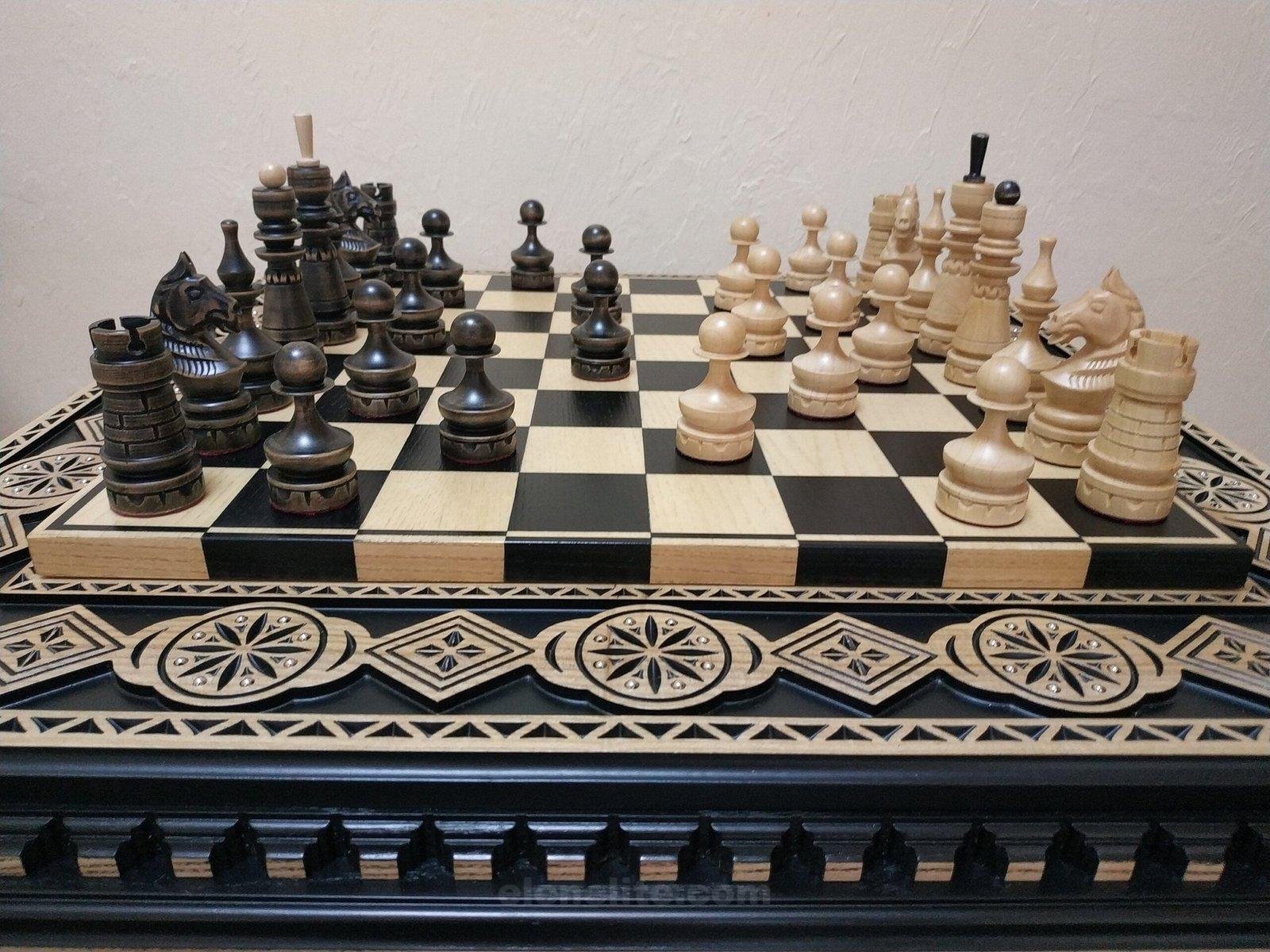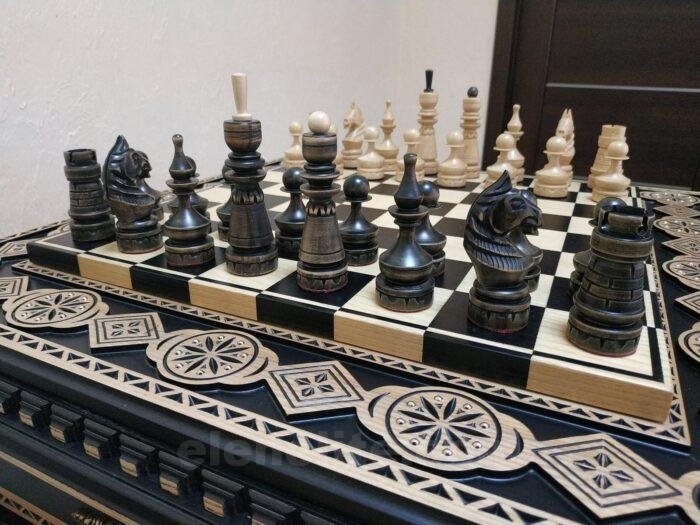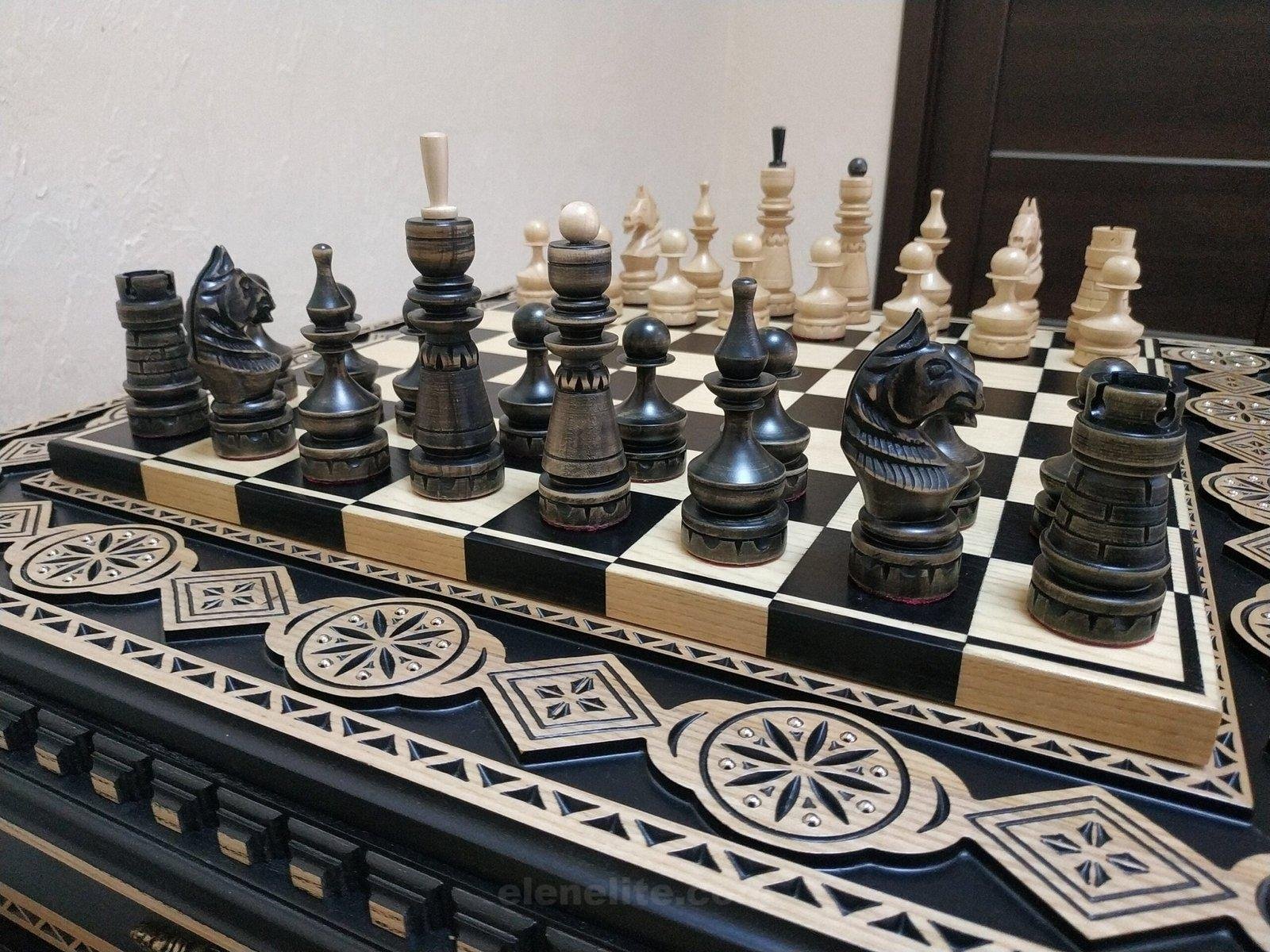 DESIGN: the chess board is decorated with carvings and beads; the chess pieces are made in a classic style; exclusively designed by our “Elen Elite” craftsmen