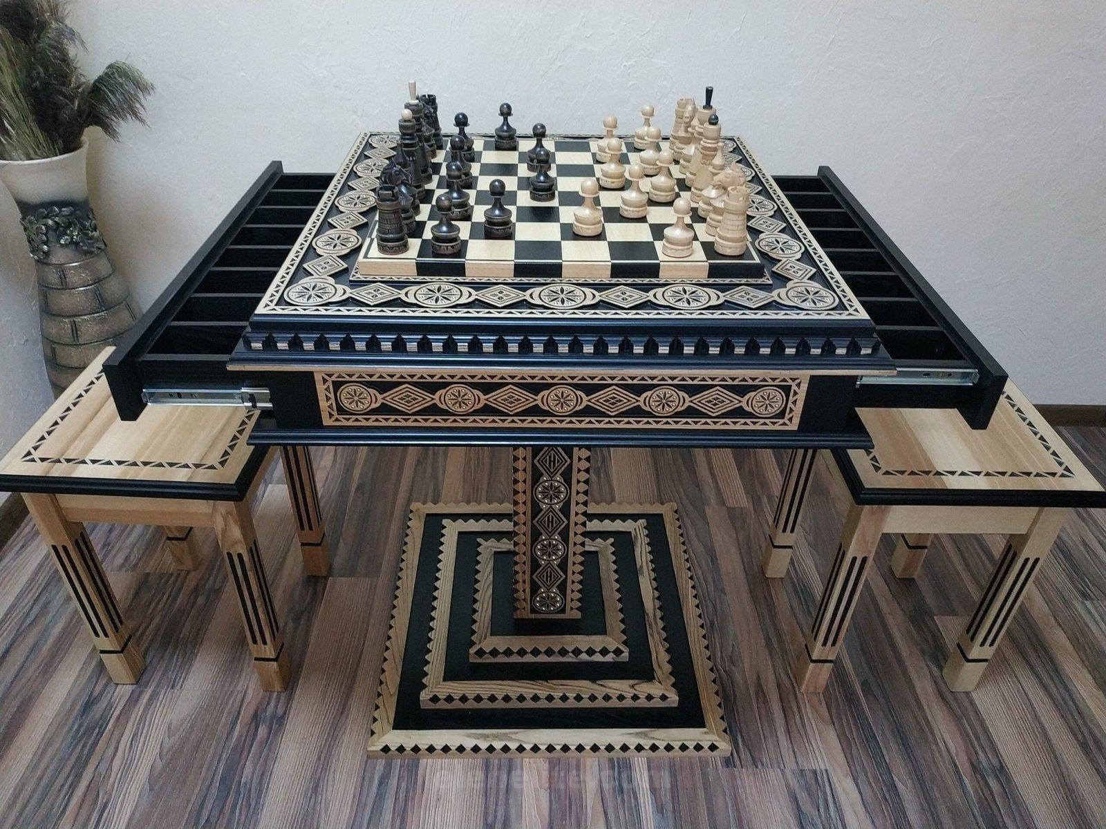 Chess Set: Chess Table “Bright Victory” with Drawers + 2 stools + chess pieces “Classic Luxe”