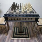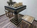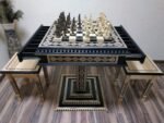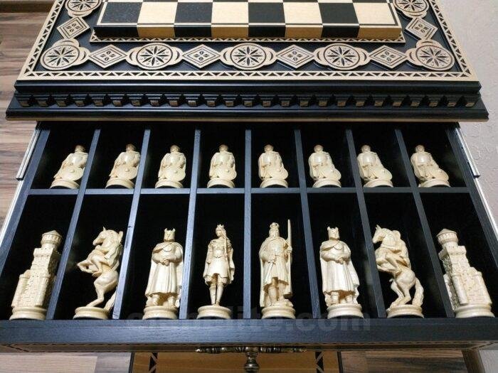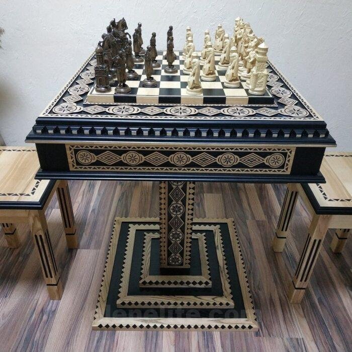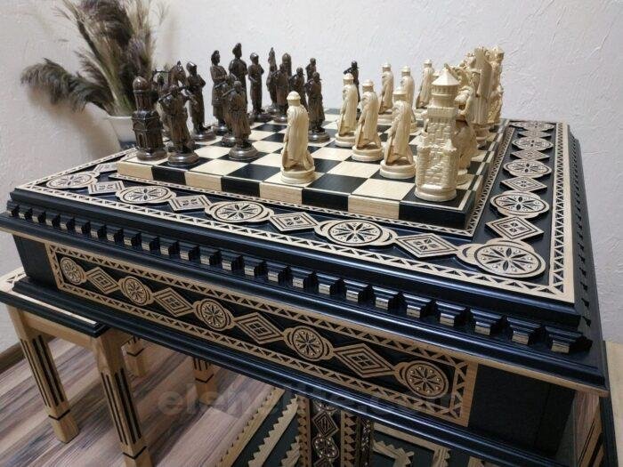 This exclusive chess set combines craftsmanship and practicality. The ash table on one leg is made in black with contrasting light carvings and exquisite beaded inlay, and the removable board allows you to play the way you like. The table is equipped with two pull-out drawers with a velvet backing and individual cells for each chess piece. The set includes two stools made in the same style. Handmade chess pieces complete this set: 16 – Cossack warriors and 16 – Knights, with the elaboration of the smallest details, turning each game into a visual pleasure.
