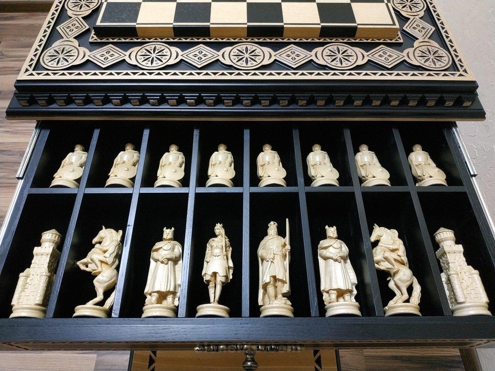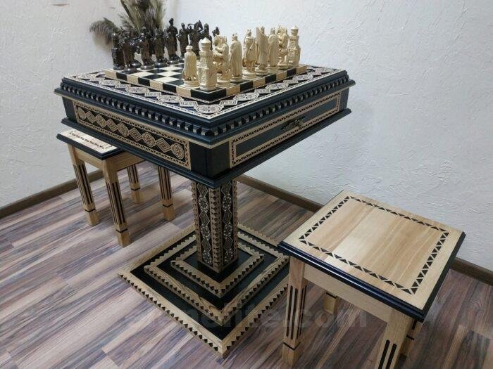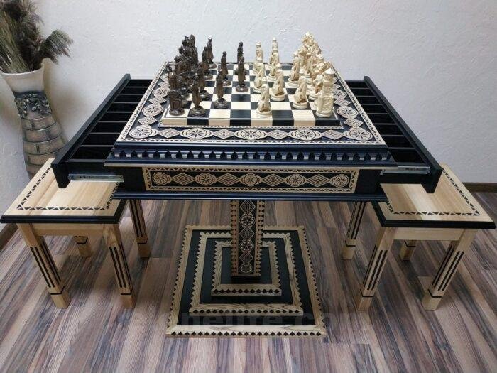 Chess Set: Chess Table “Bright Victory” with Drawers + 2 stools + chess pieces “Knights” & “Cossacks”