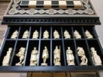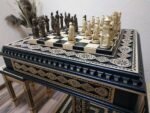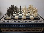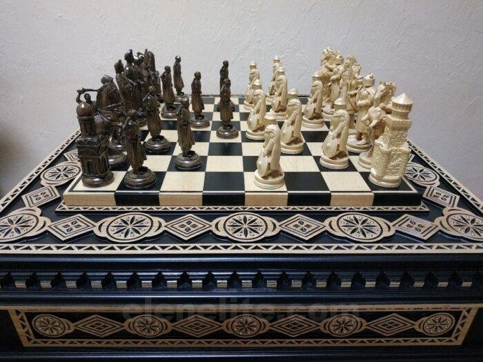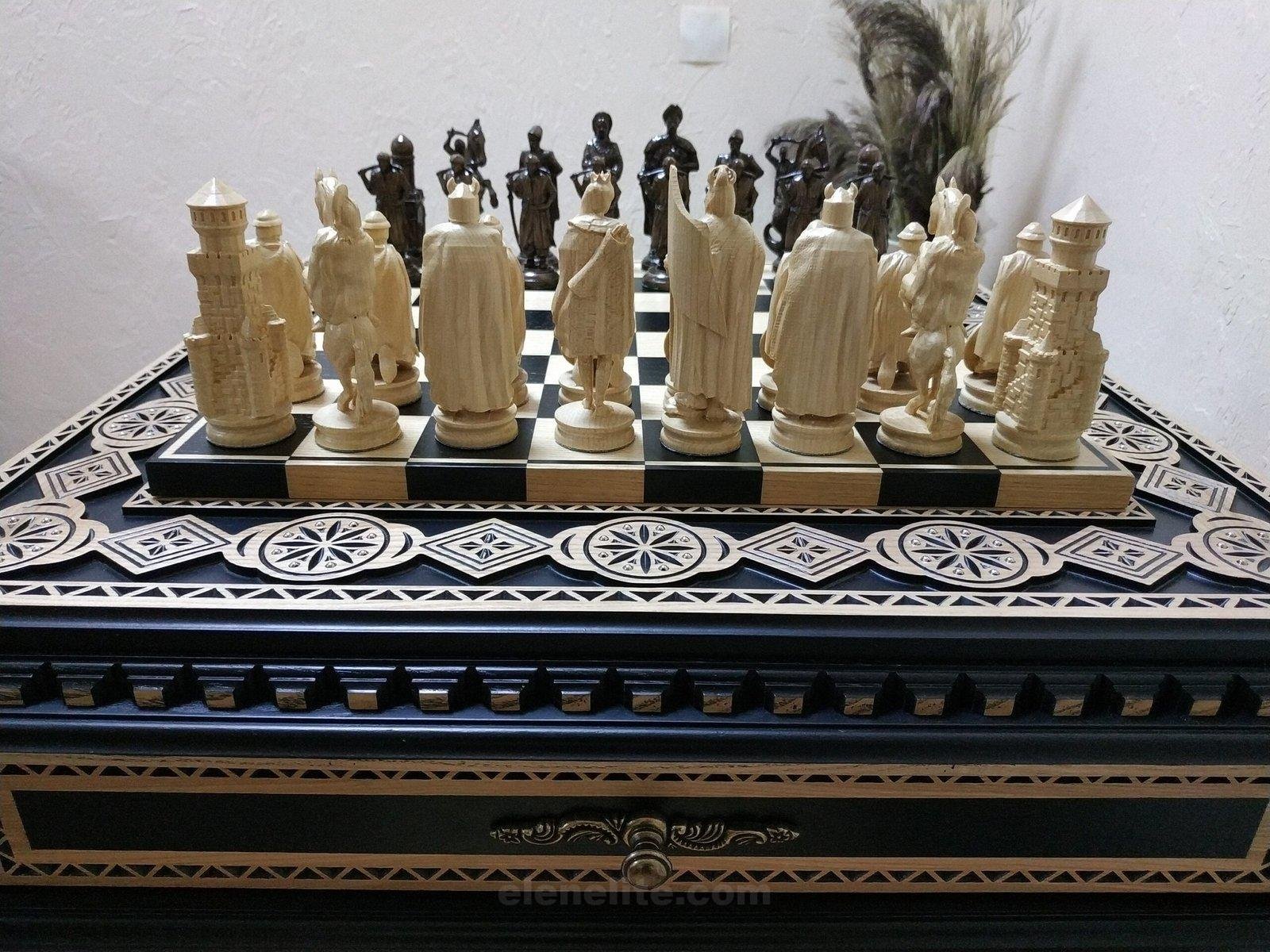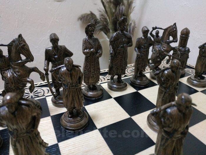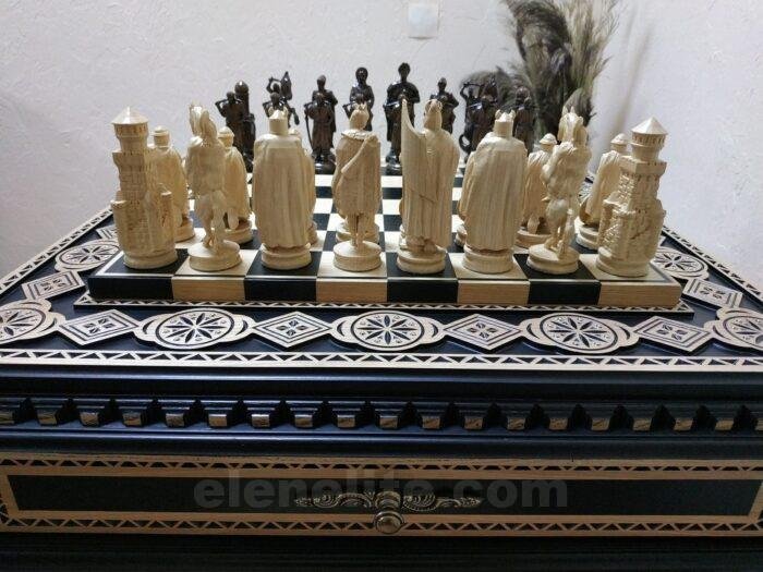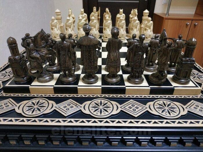 DESIGN: the chess board is decorated with carvings and beads; 16 chess pieces – Ukrainian Cossacks and 16 pieces – Knights; exclusively designed by our “Elen Elite” craftsmen