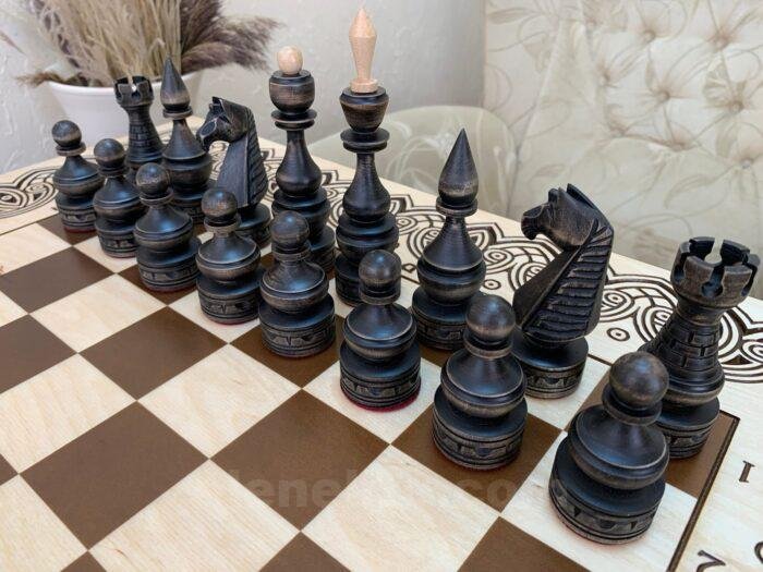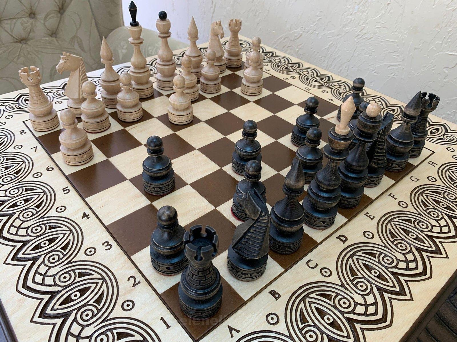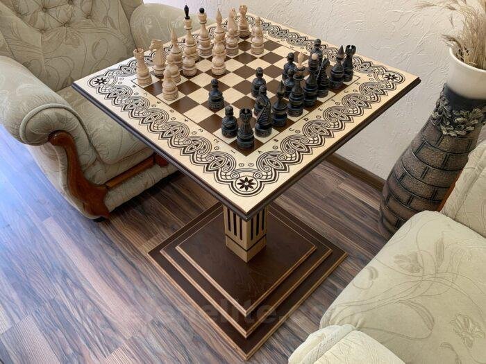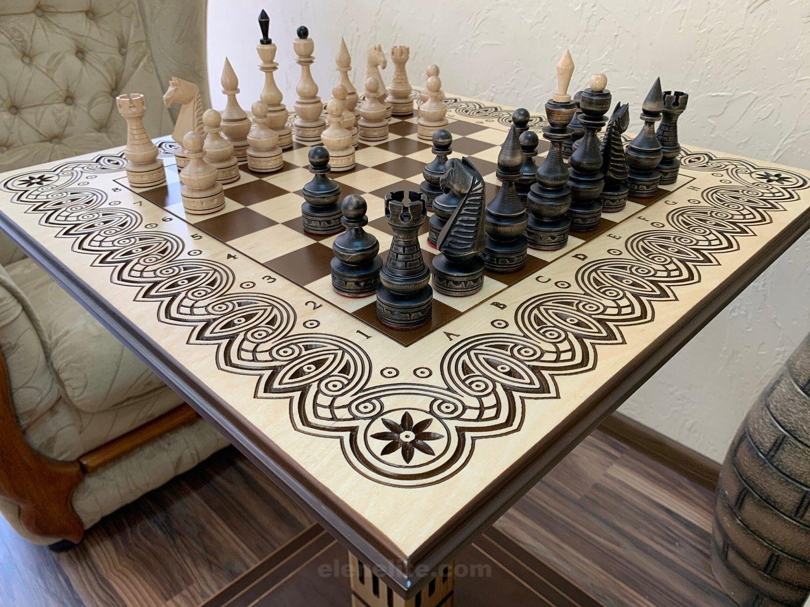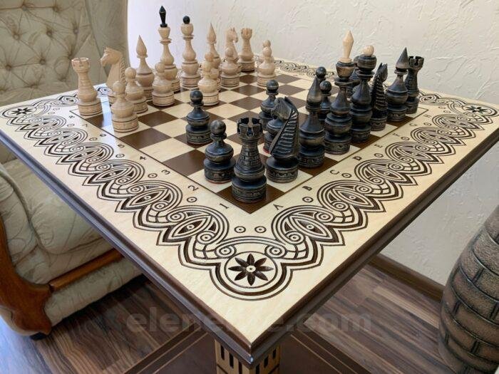 Ash chess table with carved decoration and classic maple pieces in black and beige tones – a stylish set for true connoisseurs of the game.