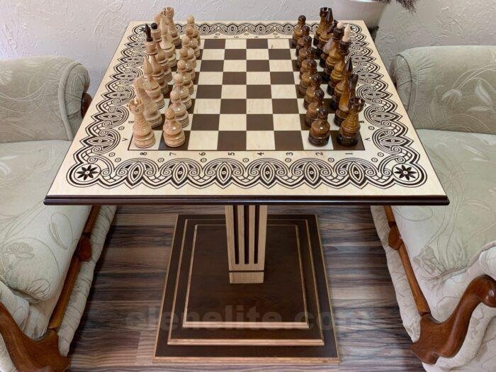 Wooden Chess Set: Chess Table “Waves of Aspiration” + glossy chess pieces “Elite”