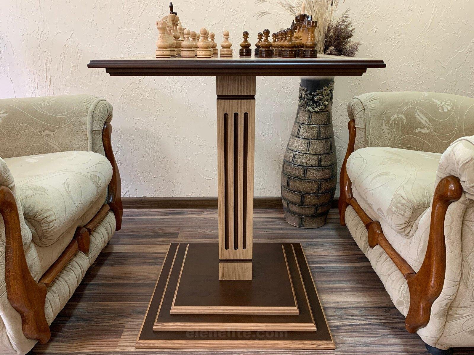 An elegant chess set for connoisseurs of classics and handcraft. The set includes a chess table made of solid ash on one sturdy leg. Its surface is made in brown and beige shades, decorated with elegant carvings and neat markings of the playing field. The set includes 32 chess pieces made in premium quality. Half of the pieces are covered in a deep brown ombre, and the rest are decorated in a noble beige shade. Thanks to the super glossy coating, they acquire a special shine and look truly luxurious.