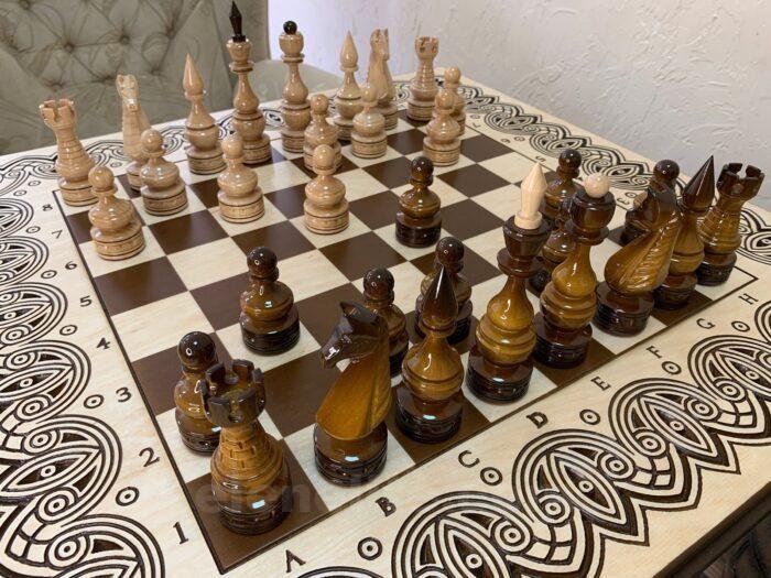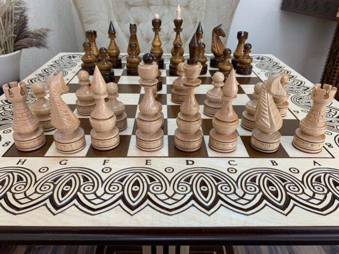 An ash chess table with carved decoration and glossy pieces in shades of brown ombre and beige – a sophisticated set for connoisseurs of the beautiful game.