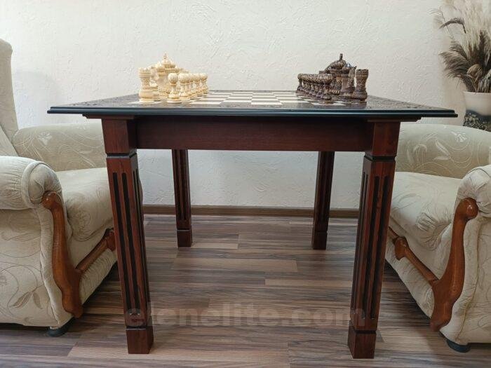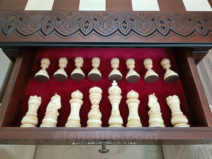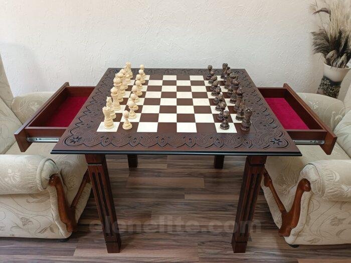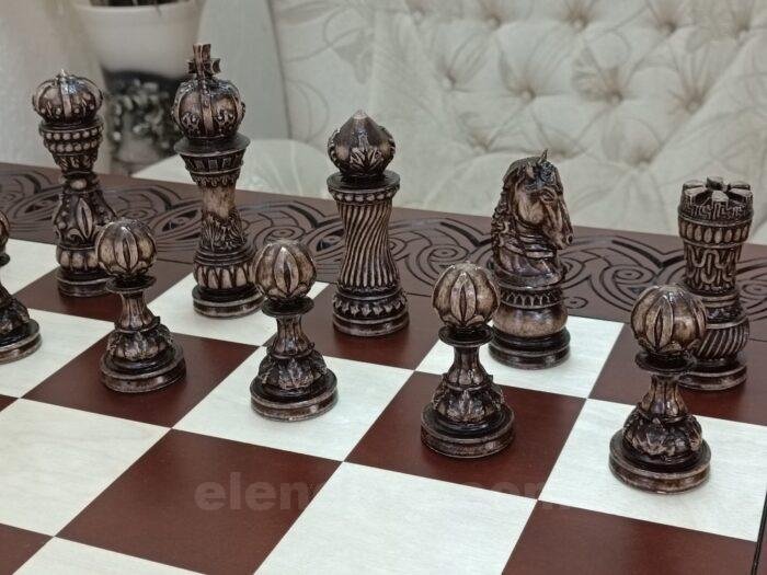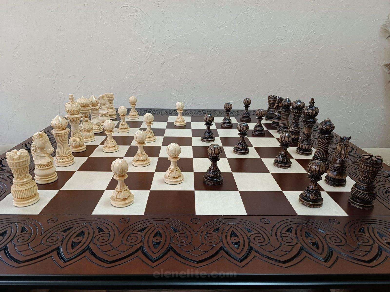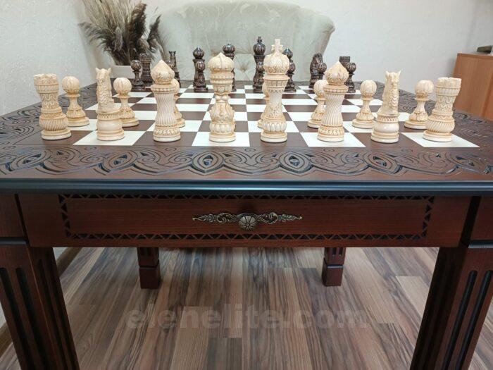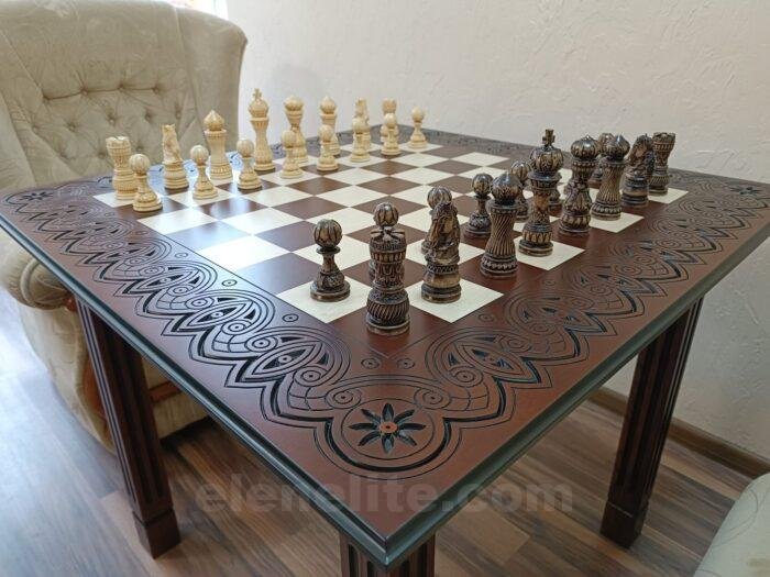 DESIGN: the chess board is decorated with carvings; the chess pieces are made in a classic style; exclusively designed by our “Elen Elite” craftsmen