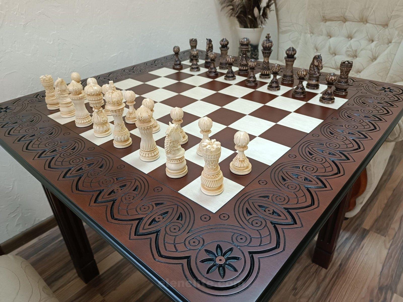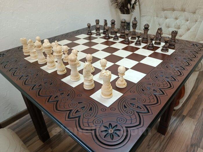 A premium dark brown ash table with four legs and a carved top, crafted in a classic style. Larger sizes are available. Classic chess pieces are included.