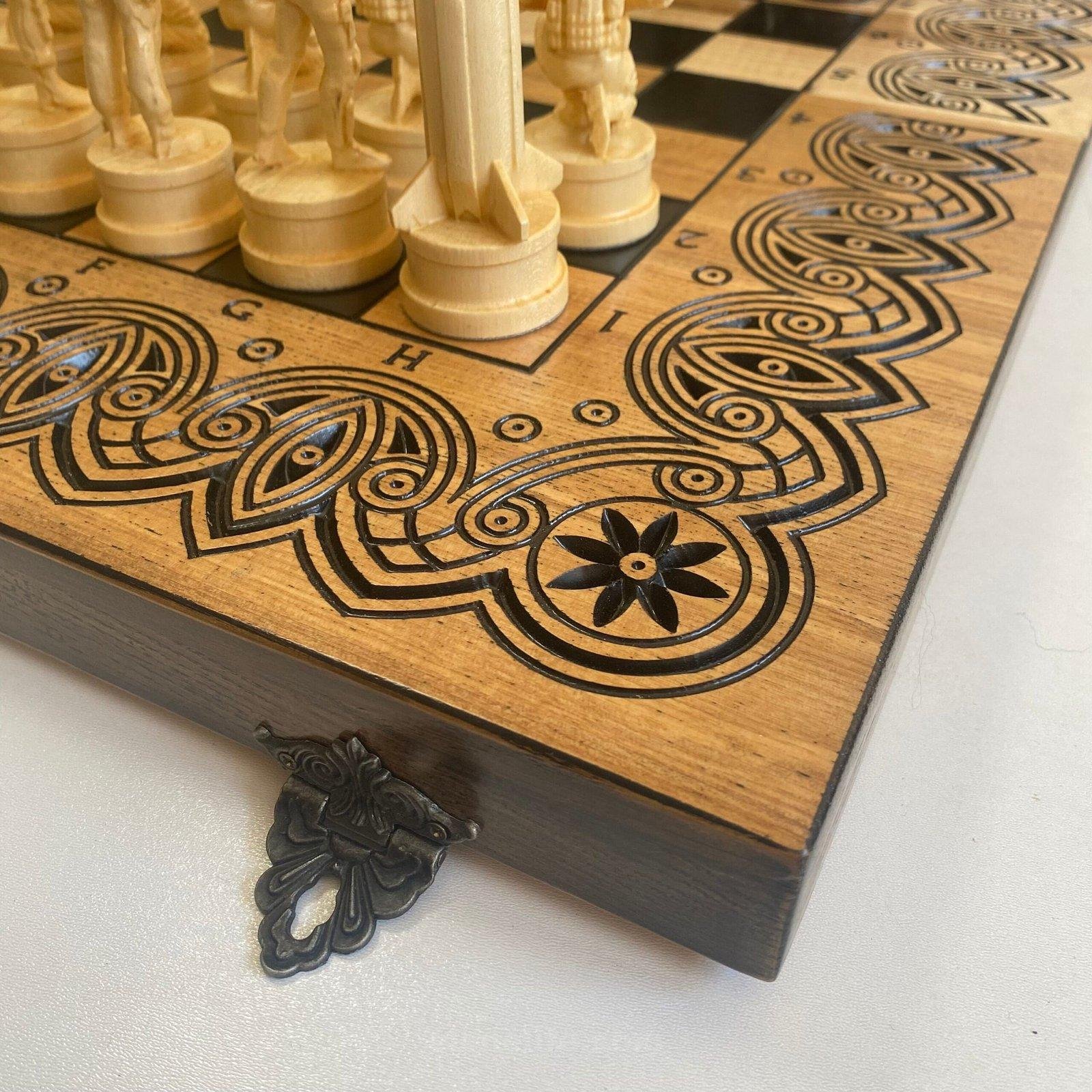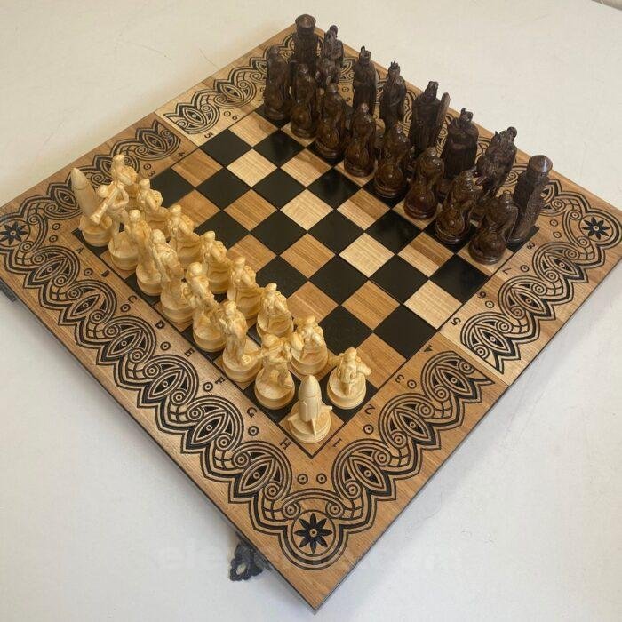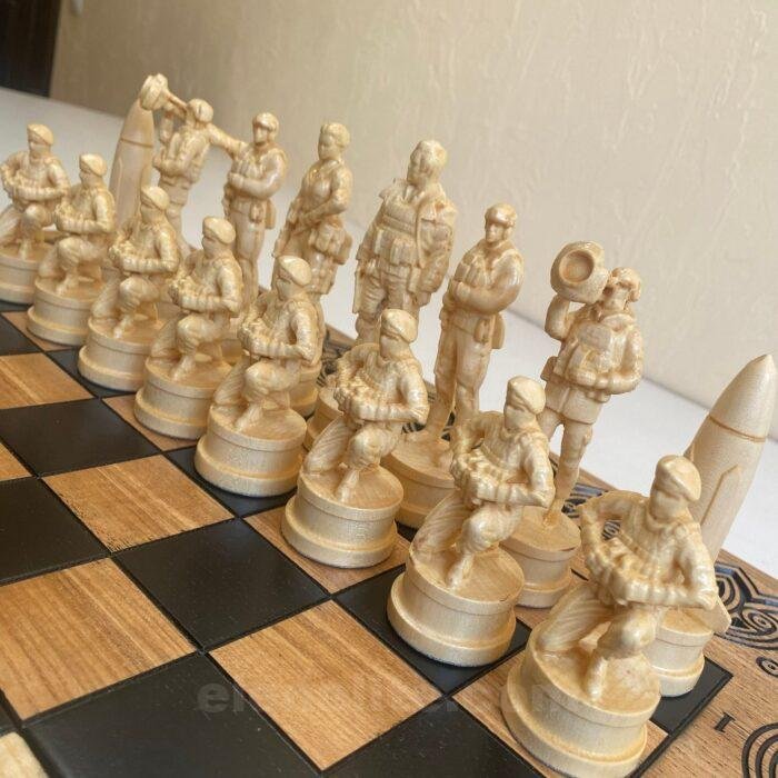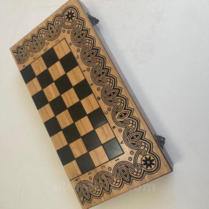 DESIGN: multifunctional folding board 3 in 1: chess, checkers and backgammon, carved patterns and markings; 16 chess pieces – Knights and 16 pieces – Ukrainian heroes: Taras Shevchenko, Lesya Ukrainka, military; exclusively designed by our “Elen Elite” craftsmen.