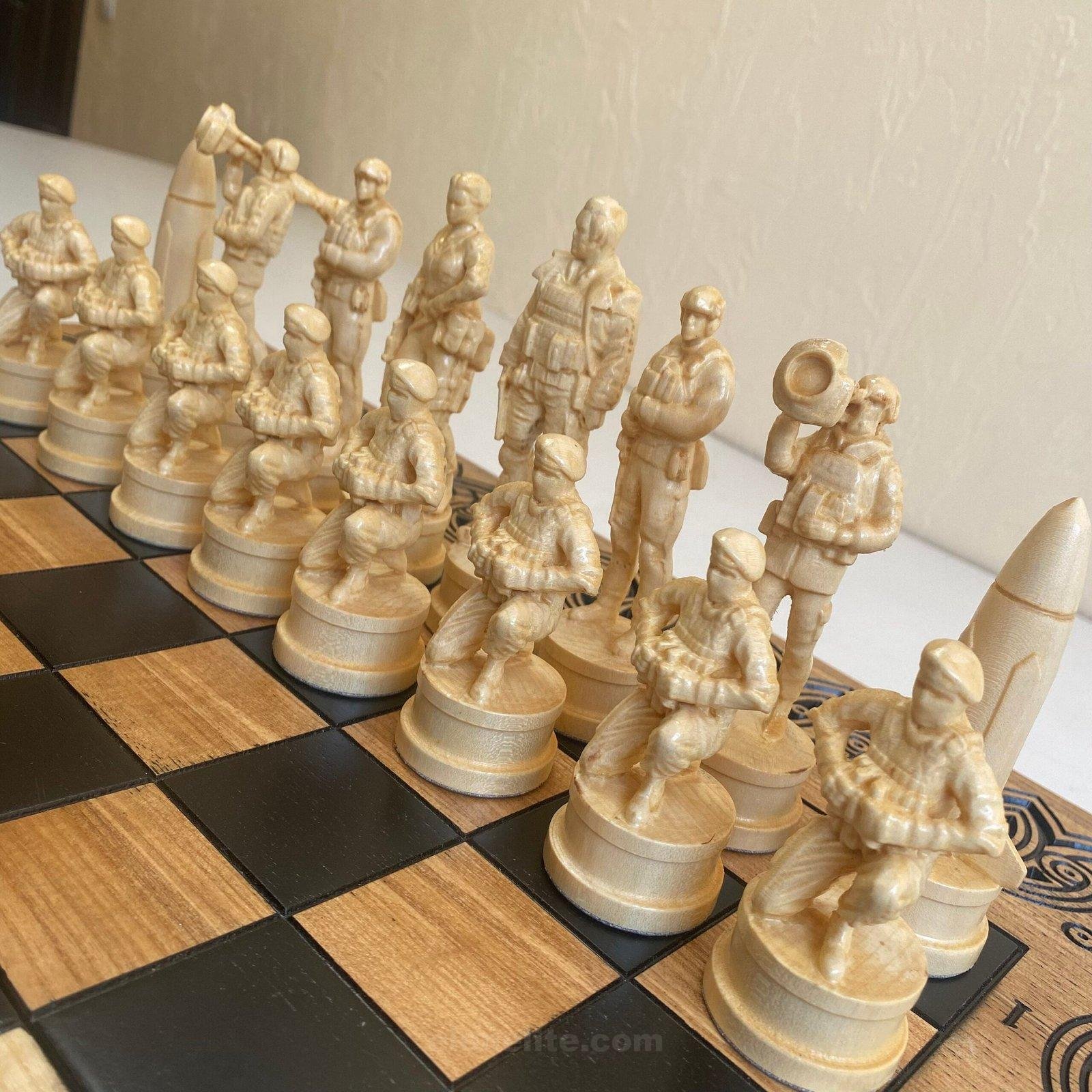 The set includes 32 unique chess pieces with detailed elaboration of clothing, weapons and facial features: 16 pieces depict Ukrainian Cossacks led by the ataman, and 16 – warriors of the Ukrainian Armed Forces, among whom the king is the poet Taras Shevchenko and the queen is Lesya Ukrainka.