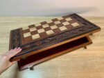 A folding chessboard with neat markings and elegant carvings on the surface is a combination of style and practicality. Inside there is a soft velvet lining that reliably protects the pieces during storage and transportation. Carved patterns add expressiveness to the board, and the thoughtful design makes it convenient for both home and travel.