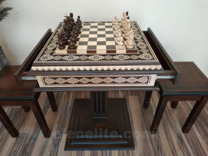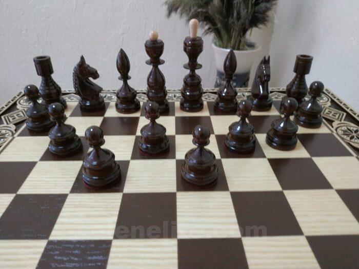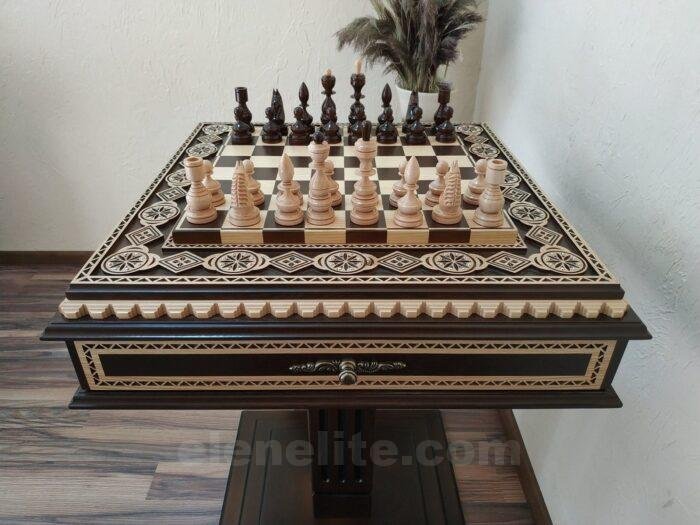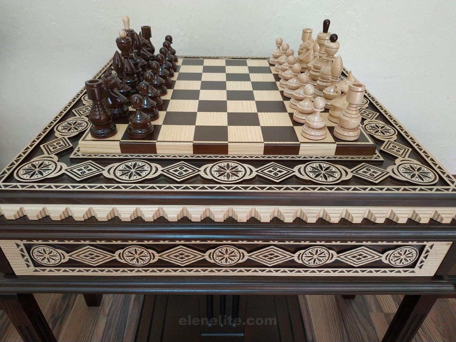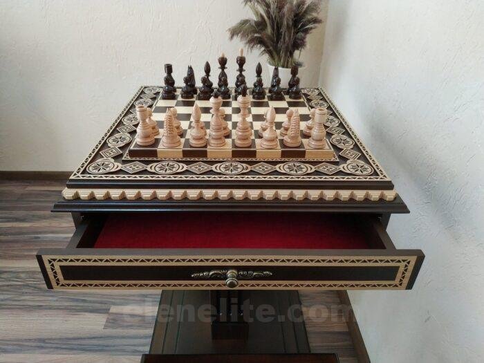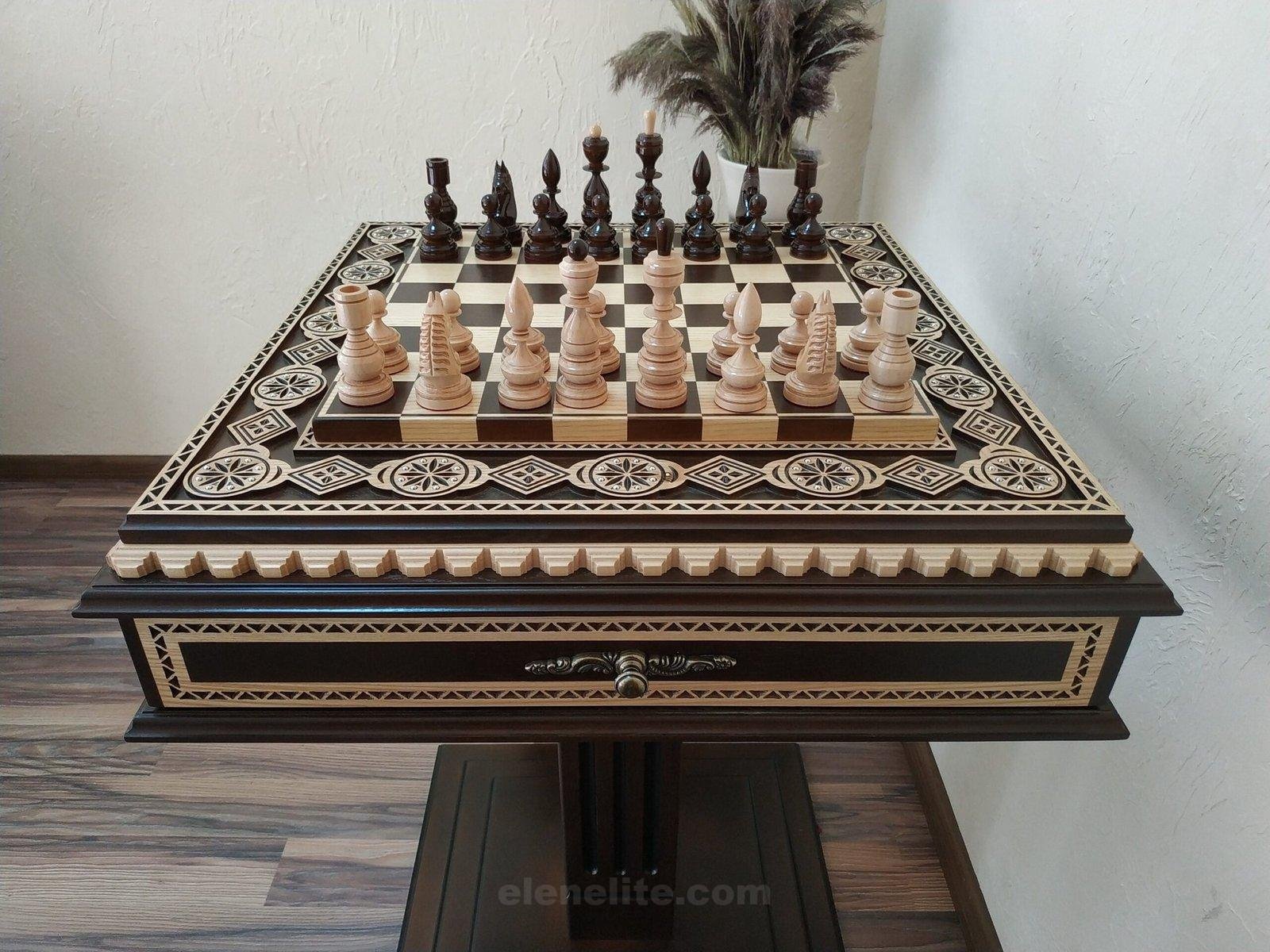 DESIGN: the chess board is decorated with carvings and beads; the chess pieces are made in a classic style; exclusively designed by our “Elen Elite” craftsmen