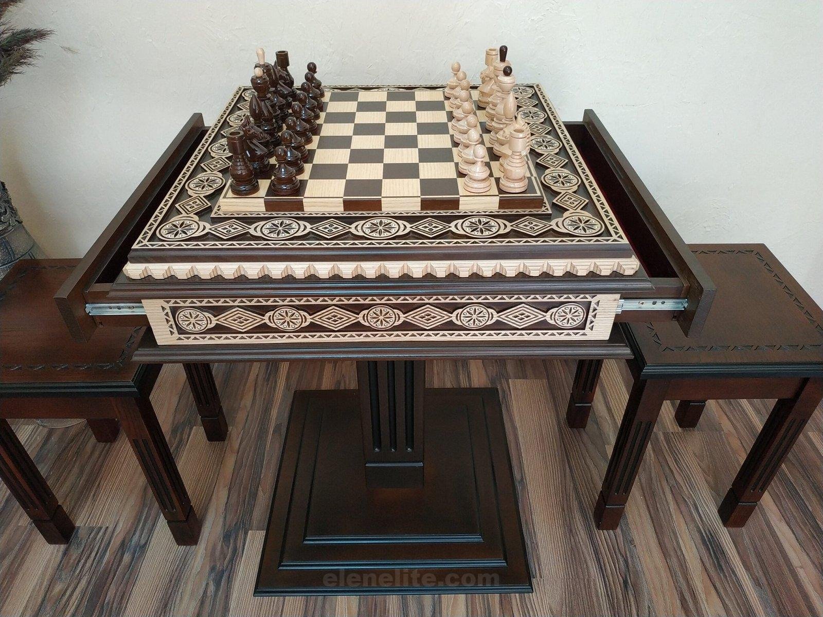 Chess Set: Chess Table “Bright Victory” with Drawers, dark color + 2 stools + chess pieces "Classic Deluxe"