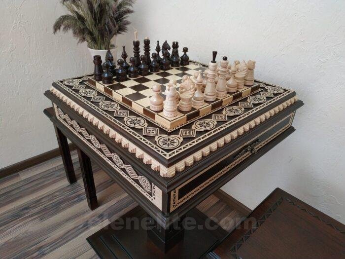 This ash table features two drawers and a velvet lining. The top is decorated with contrasting carvings and beaded inlay. The set includes two dark ash stools and a classic dark chess set — an elegant and stylish piece.