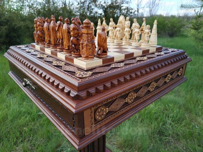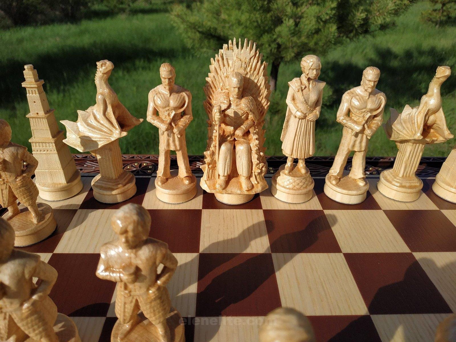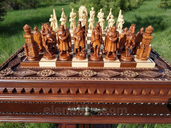 DESIGN: the chess board is decorated with carvings and beads; 16 pieces – characters from the series “Game of Thrones” and 16 pieces – Knights; exclusively designed by our “Elen Elite” craftsmen