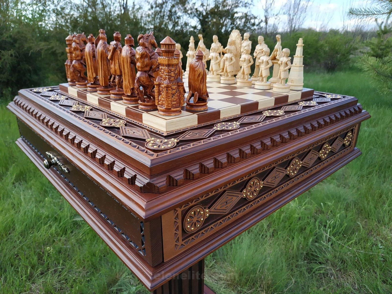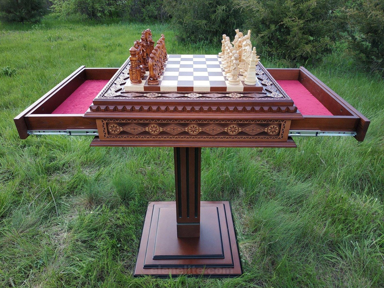 Chess Set: Chess Table "Battle for Kings" with 2 Drawers + 2 stools + pieces “Knights” & “Game of Thrones”