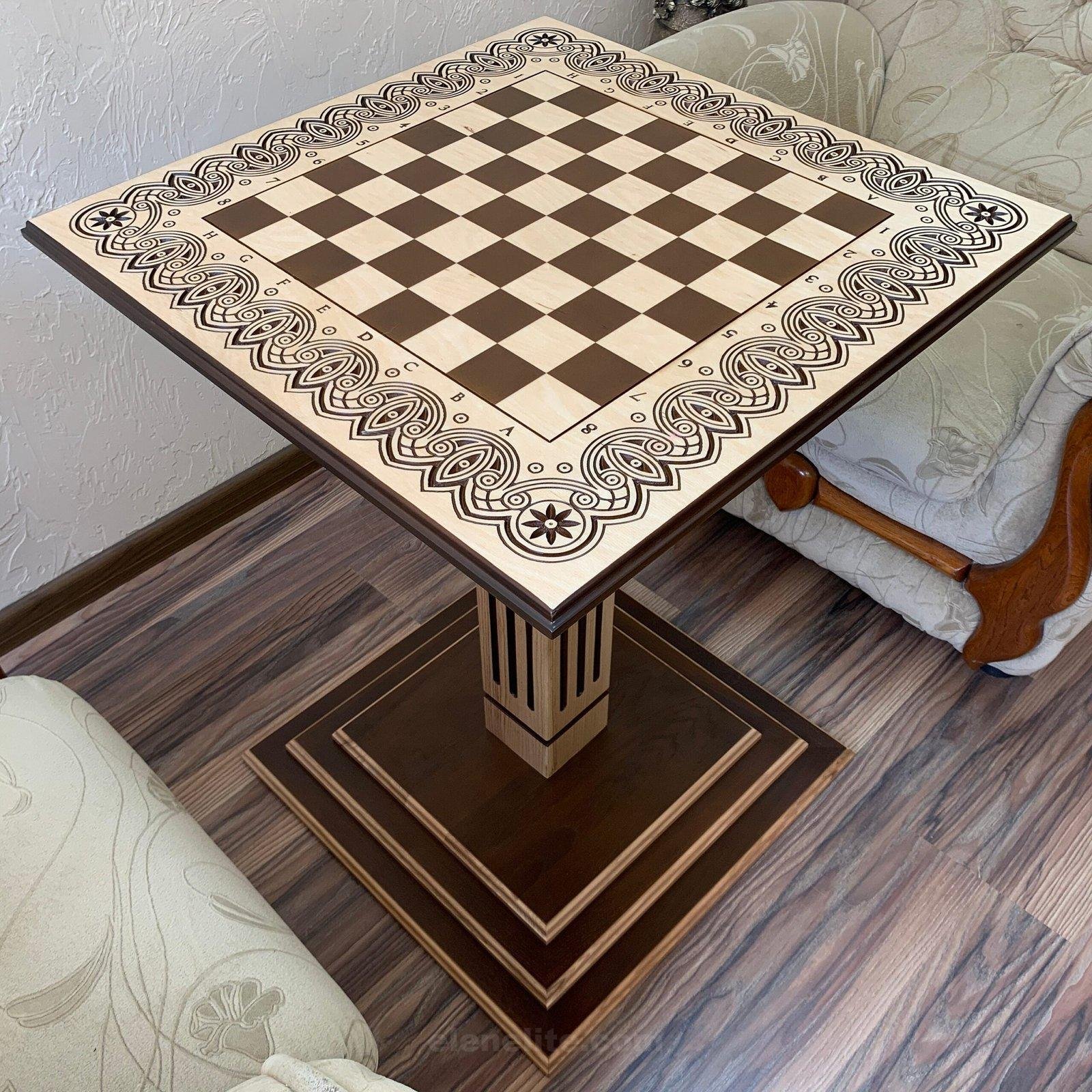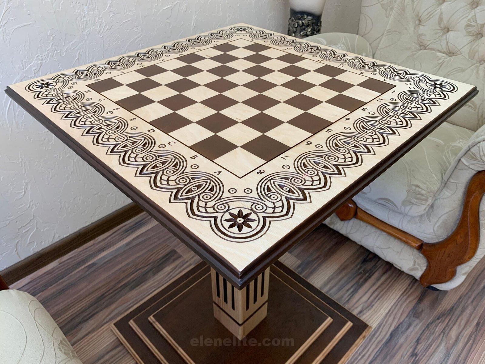 A chess table made of ash in natural shades with carvings and field markings is a stylish and functional interior decoration.