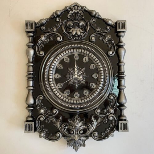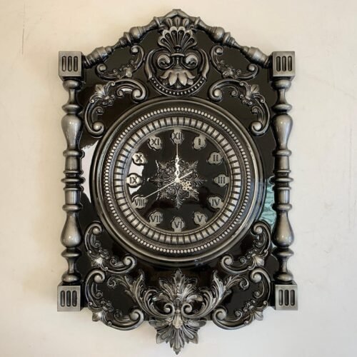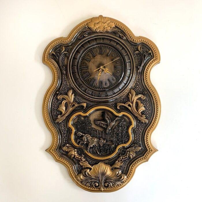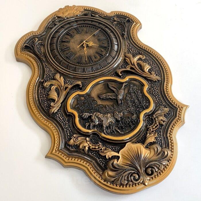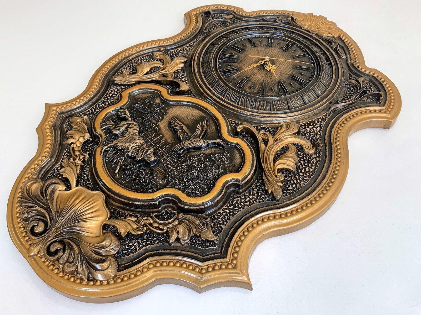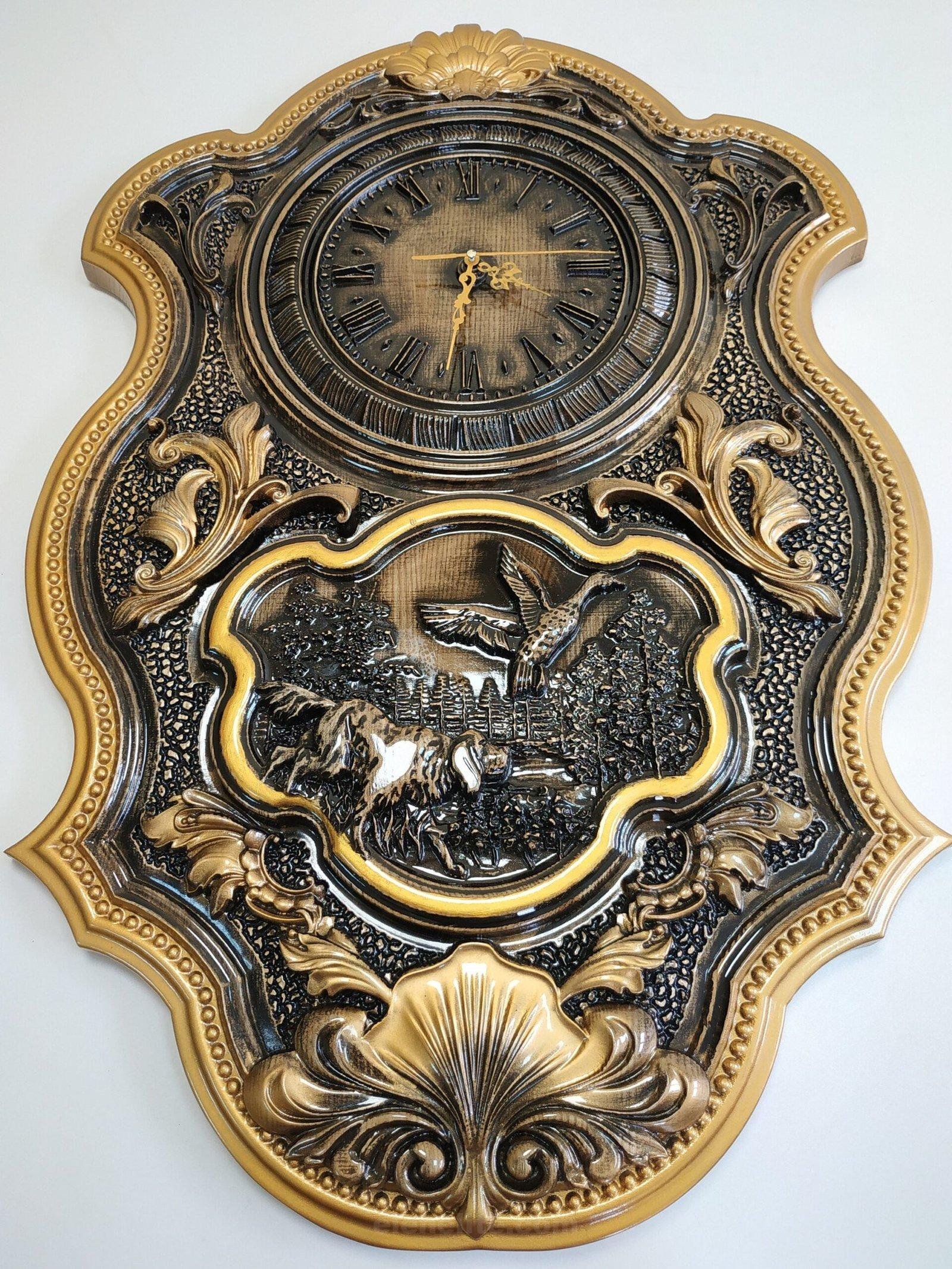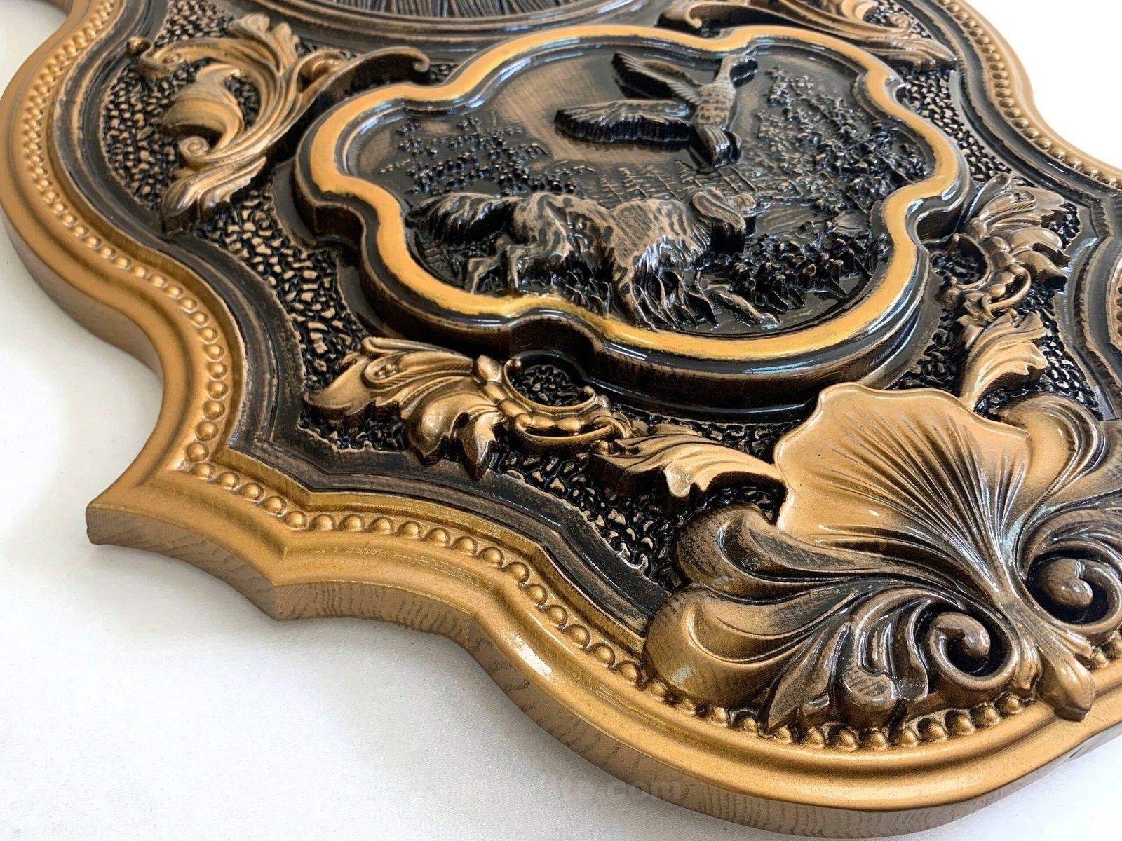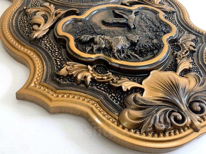 Wooden wall Clock Large, Wall Art ,color Black & Gold patina, pattern – hunting, nature, super gloss, handmade carving wood, Anyversary Gift