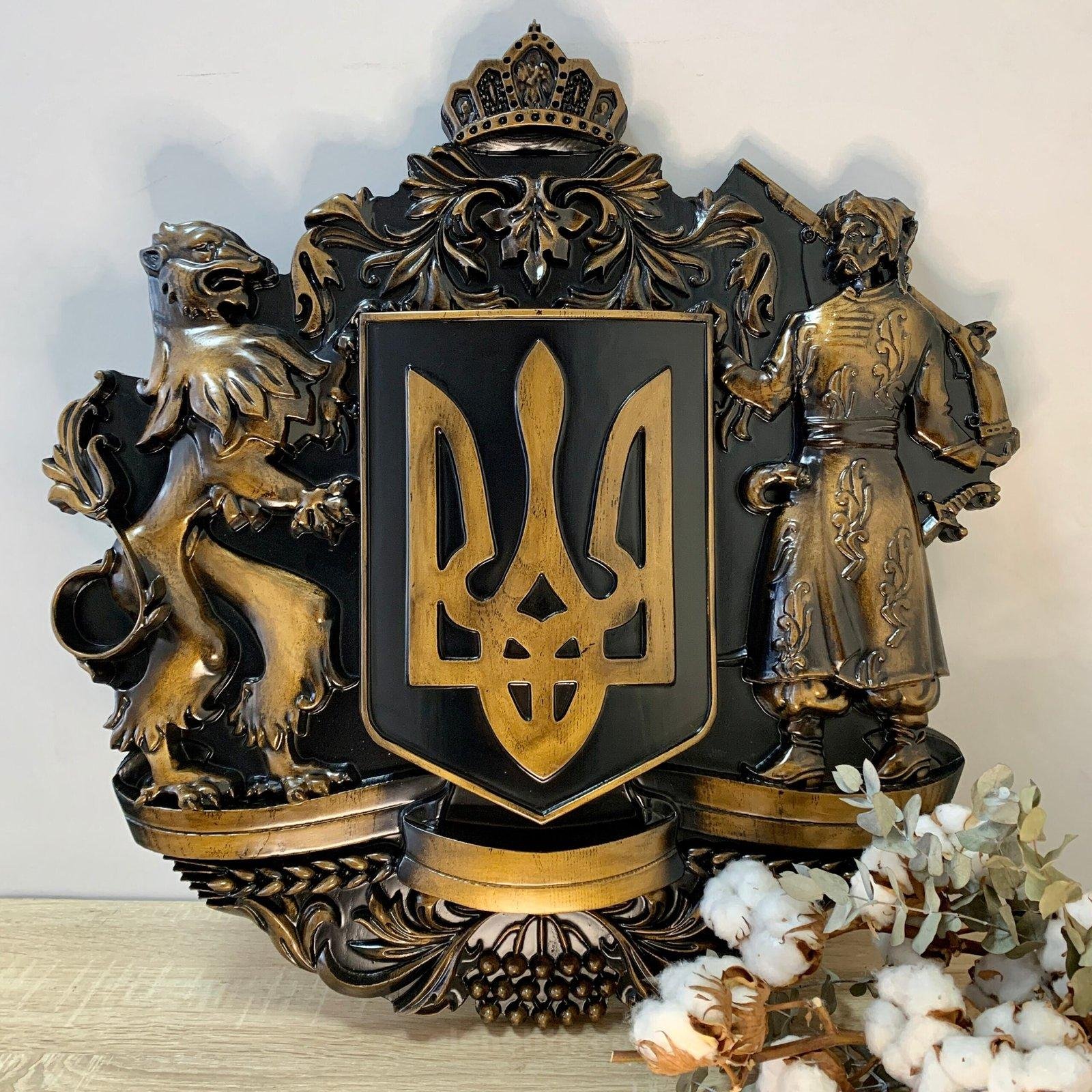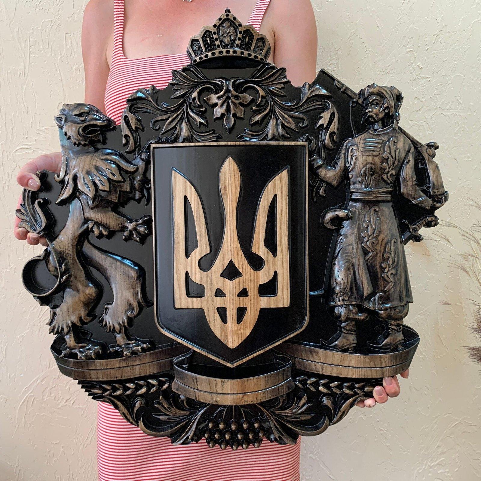 Introducing the exquisite Wooden Coat of Arms of Ukraine with Cossack, Lion, Viburnum – Symbols of Ukraine and Trident. This stunning piece of wall decor is meticulously crafted using solid ash wood, making it a truly unique and eye-catching addition to any home or office.