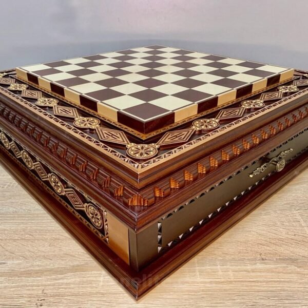 An elegant chess board decorated with carvings and decorative beads. Two drawers for careful storage of pieces.