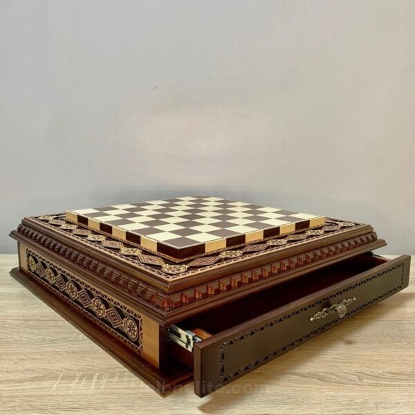 An elegant chess board decorated with carvings and decorative beads. Two drawers for careful storage of pieces.