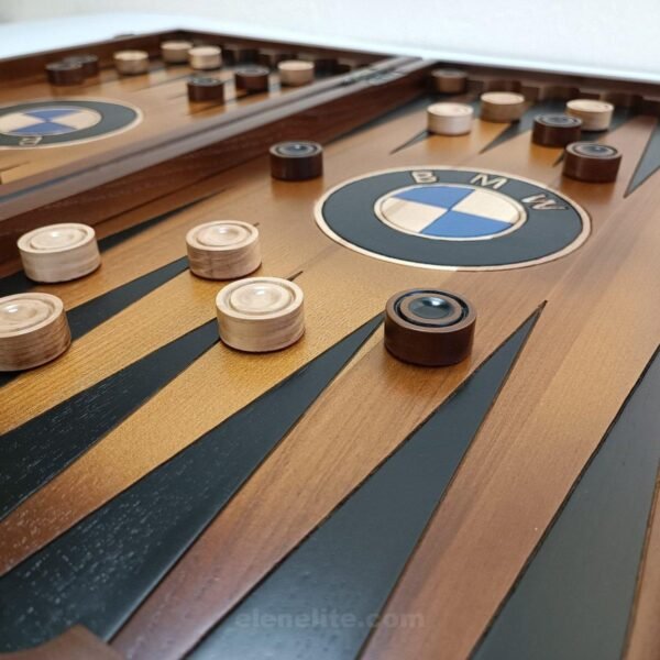 A wooden backgammon field with backgammon chips made from ash solid wood, featuring carving that is handmade , would make