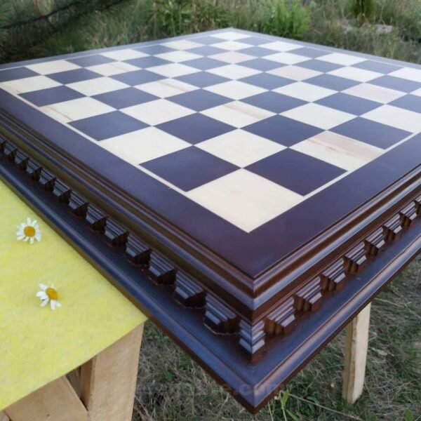 Chess board "Royal Classic" made of ash - strict dark brown color, decorated with elegant light carving. Elegance and handwork in every element.
