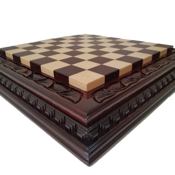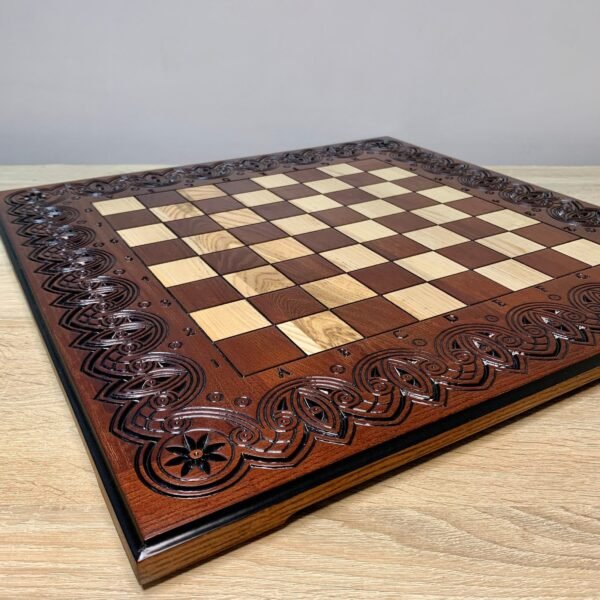 Handcrafted ash chess board in dark brown color. Decorated with delicate carved pattern - an elegant combination of classic and craftsmanship.