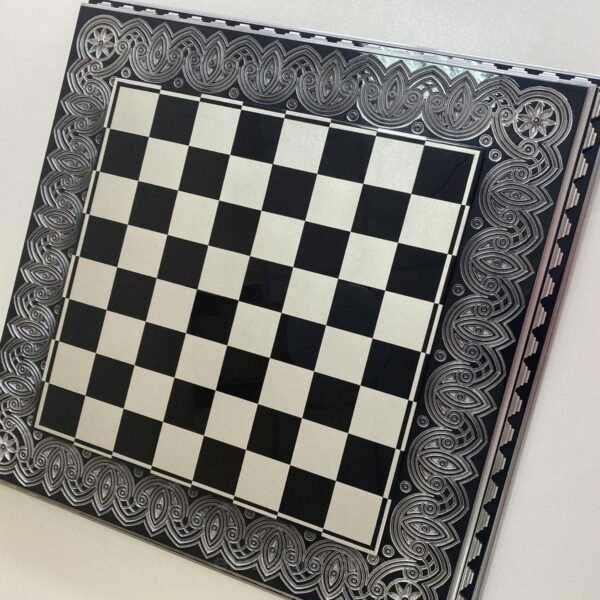 An elegant wooden chess board with a removable game board and velvet storage for the pieces. The deep black and silver color, super-gloss finish and exquisite carving give the board a luxurious look.